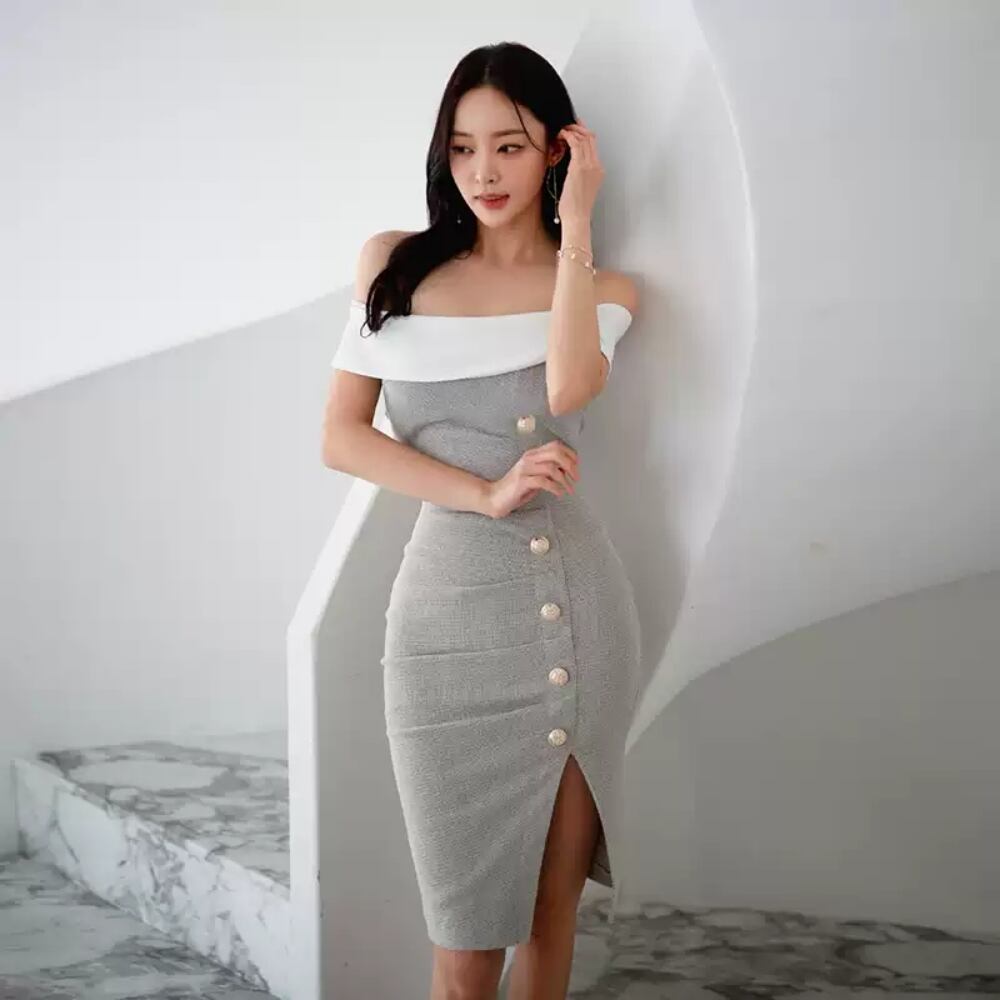 レディース ワンピース シースドレス 膝丈 ミディ 半袖 オフショルダー タイト スリム 細身 ボディコンシャス アワーグラスライン サイドスリット ファスナー ハイウエスト バイカラー 飾りボタン 薄手 かわいい 大人可愛い シンプル カジュアル 上品 おしゃれ エキゾチック エレガント モダン 抜け感 キュート 都会的 セクシー 色気 シック 華やか 無地 春 夏 デート パーティー キャバ ラウンジ スタイルアップ 肌見せ S M L XL グレー