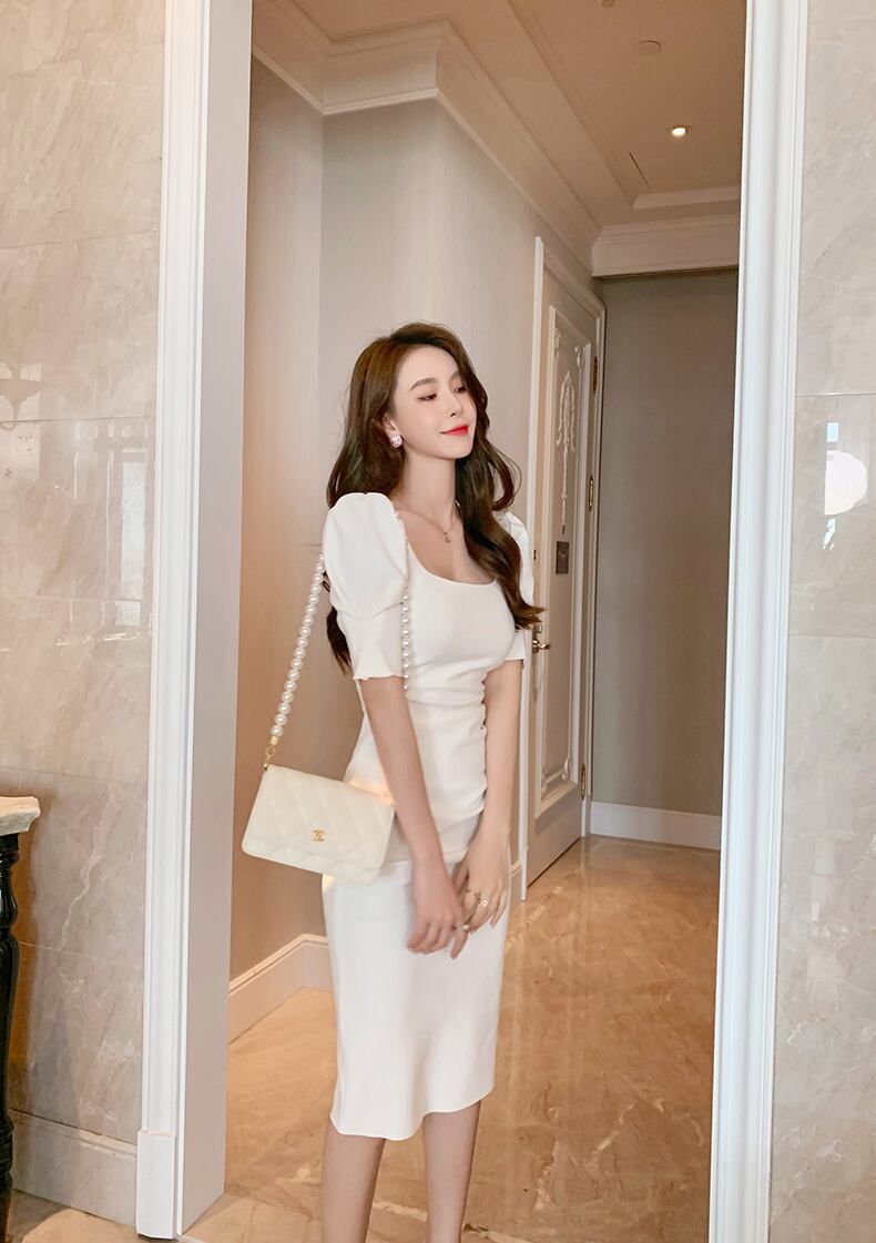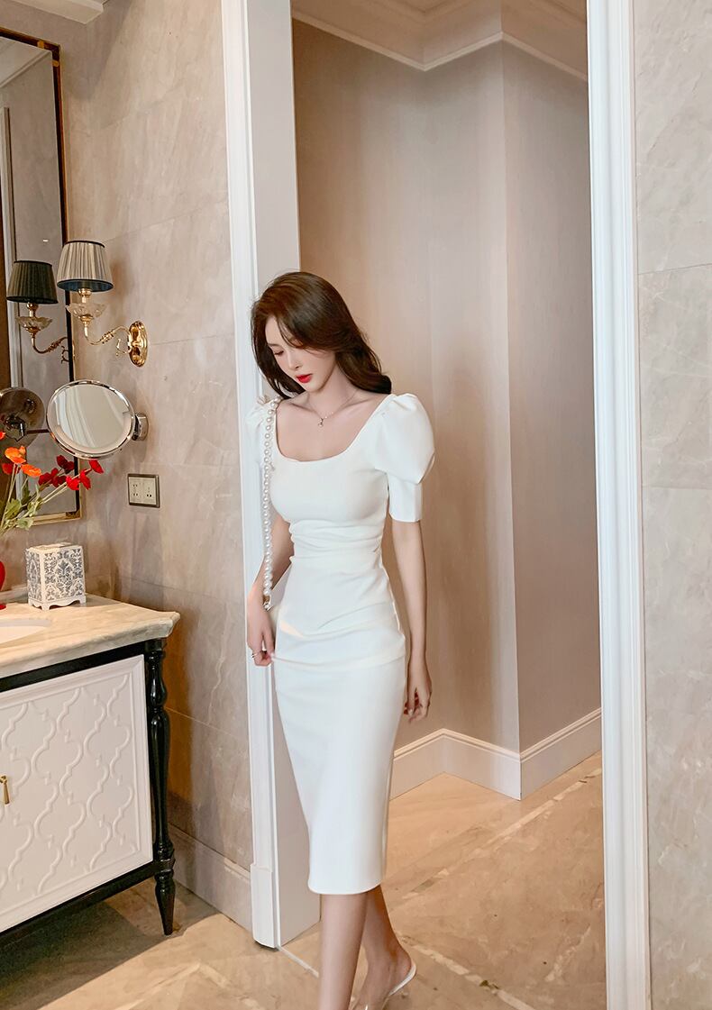 レディース ワンピース ドレス シースドレス 膝丈 膝下 ミディ 5分袖 パフスリーブ スクエアネック タイト スリム 細身 フェミニン スレンダー アワーグラスライン ヌードバック ハイウエスト かわいい 大人可愛い きれいめ シンプル 上品 おしゃれ エキゾチック エレガント 抜け感 都会的 ロマンティック セクシー 色気 シック ノーブル 華やか 無地 春 夏 二次会 お呼ばれ お出かけ パーティー 普段使い スタイルアップ 肌見せ S M L XL 2XL 白 ホワイト 黒 ブラック