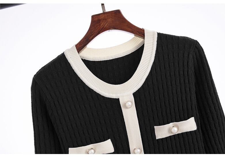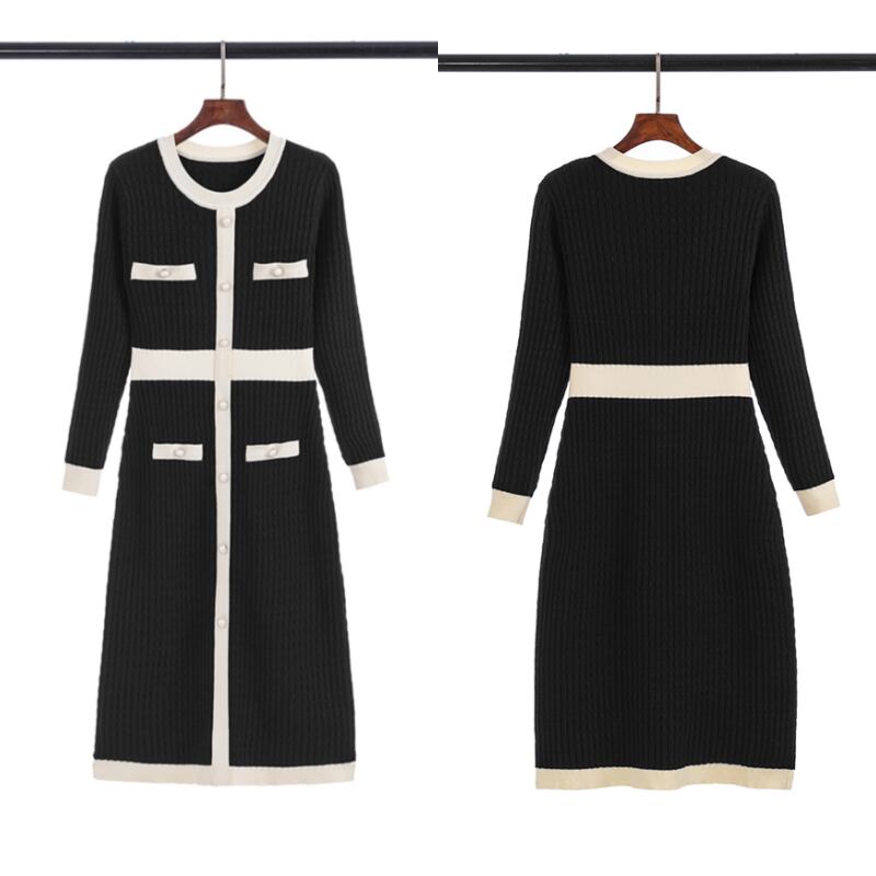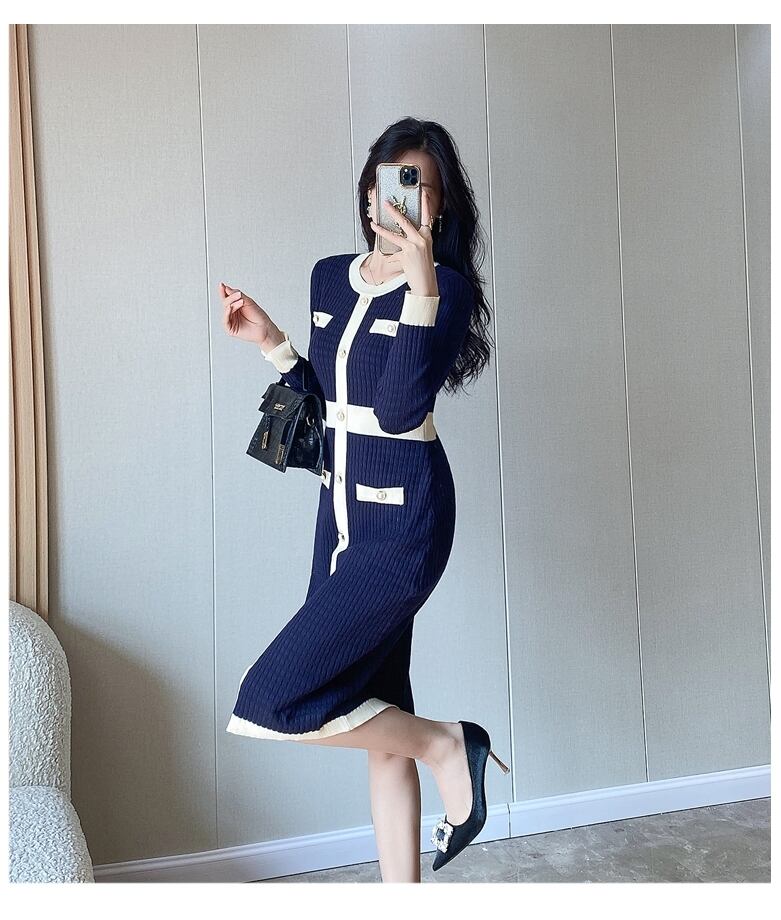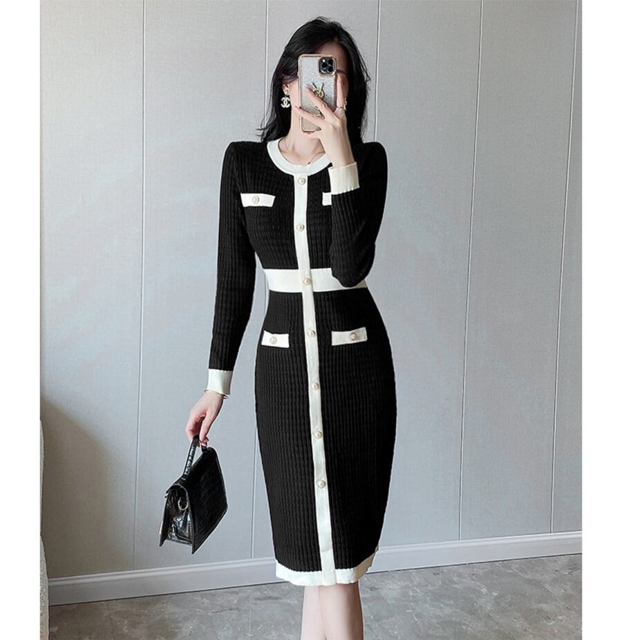 レディース ワンピース ニットワンピ セータードレス 膝丈 膝下 ミディ 長袖 ラウンドネック スリム 細身 スマート フェミニン スレンダー ウエストマーク ハイウエスト リブニット コンサバ バイカラー 飾りボタン ストレッチ 伸縮性 かわいい 大人可愛い きれいめ シンプル 上品 おしゃれ エレガント 抜け感 かっちり 都会的 プレッピー シック ノーブル 華やか 春 秋 冬 デート お出かけ 楽ちん 普段使い スタイルアップ S M L XL ブラック ネイビー
