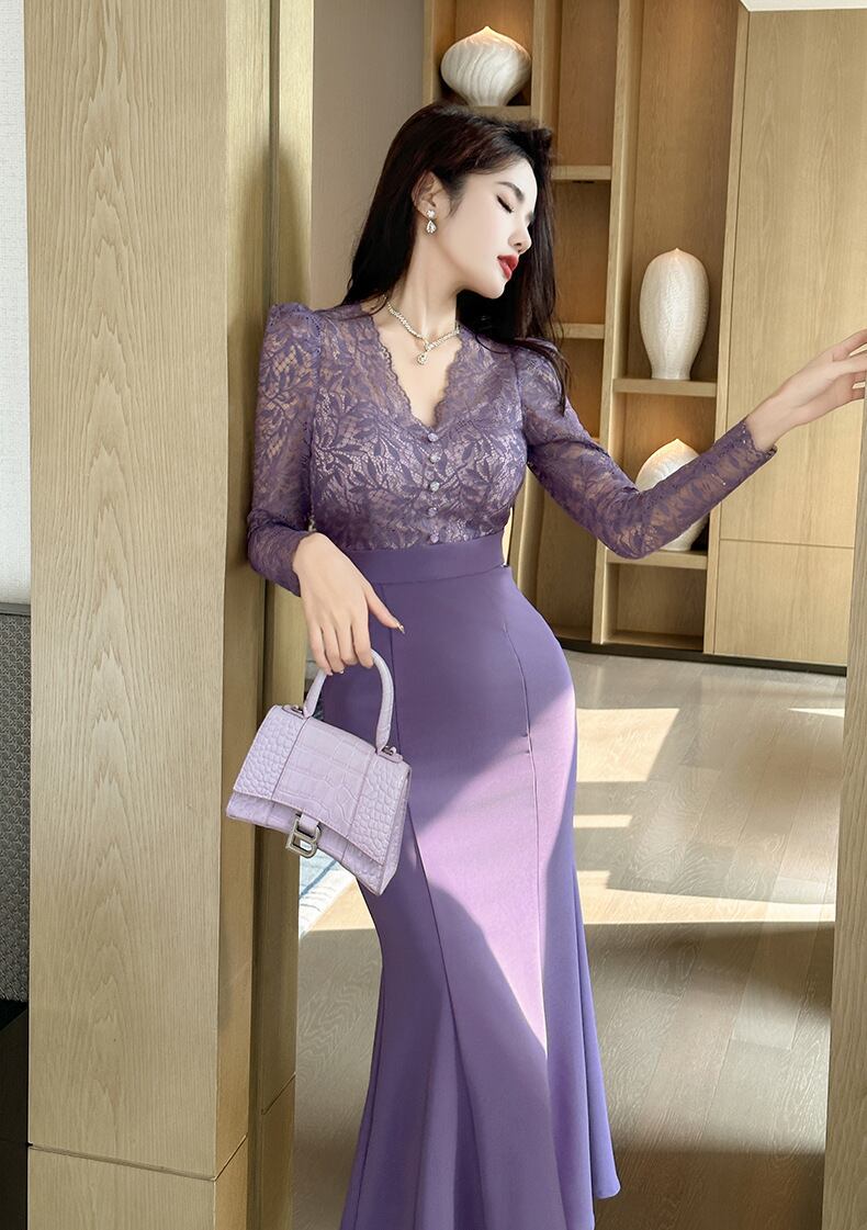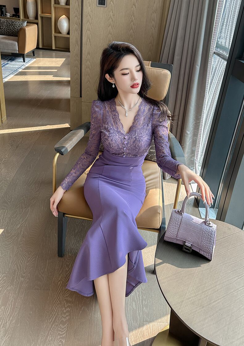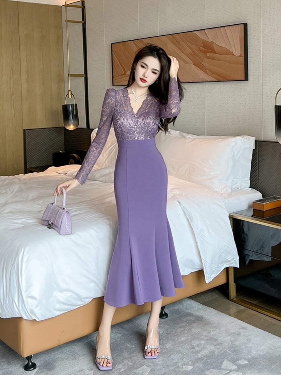 レディース スカート ワンピース ドレス フレアスカート マーメイドスカート ロングスカート 膝下 ミモレ ロング マキシ 7分袖 長袖 Vネック セミフレア タイト スリム 細身 マーメイド レース ファスナー ハイウエスト 透け感 大人可愛い きれいめ シンプル 上品 おしゃれ かっこいい エレガント セクシー 無地 ボタニカル 春 夏 秋 冬 オールシーズン デート お出かけ パーティー イベント レストラン 休日 コンサート コーデ モテ 清楚 スタイルアップ S M L 大人カラー パープル