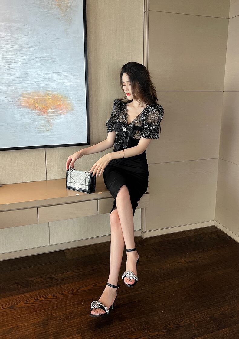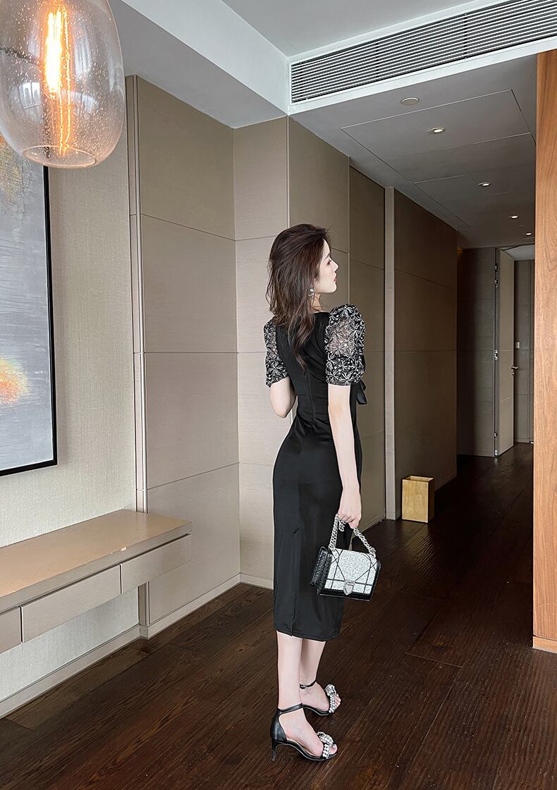 レディース スカート ワンピース ドレス タイトスカート ロングスカート 膝丈 ミモレ 半袖 5分袖 パフスリーブ Vネック タイト スリム 細身 レース リボン ファスナー ハイウエスト 透け感 かわいい 大人可愛い きれいめ 上品 おしゃれ かっこいい クール エレガント 主役級 存在感 セクシー 色気 無地 春 夏 秋 デート お出かけ パーティー イベント リゾート 休日 バカンス ホテル コンサート コーデ 脚長 モテ スタイルアップ S M L XL 黒 ブラック ベーシックカラー 大人カラー