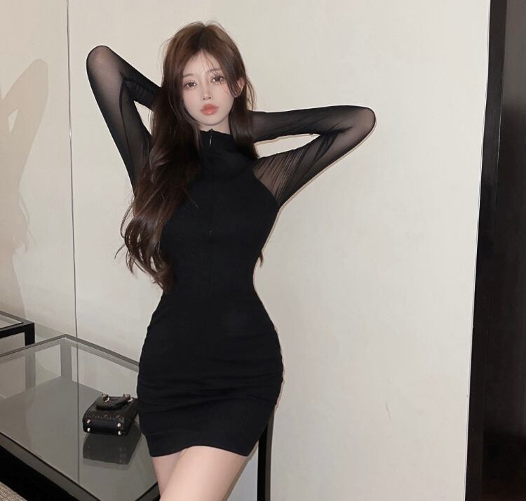 レディース ワンピース ミニ 長袖 ハイネック タイト スリム 細身 スキニー ボディコンシャス アワーグラスライン ファスナー 透け感 シースルー シアー ストレッチ 伸縮性 大人可愛い シンプル カジュアル おしゃれ かっこいい エキゾチック 個性的 クール モード系 エレガント モダン 抜け感 都会的 セクシー 色気 無地 春 秋 デート お出かけ クラブ キャバ ラウンジ 普段使い 肌見せ S M L 黒 ブラック