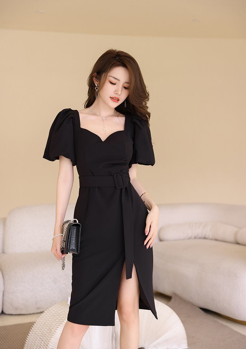レディース ワンピース ドレス 膝丈 ミディ 半袖 ボリューム袖 パフスリーブ ハートネック タイト スリム 細身 フェミニン ボディコンシャス スレンダー アワーグラスライン ウエストマーク サイドジップ ハイウエスト かわいい 大人可愛い シンプル カジュアル 上品 おしゃれ エレガント 抜け感 キュート 都会的 セクシー 色気 シック 華やか 無地 春 夏 お呼ばれ お出かけ パーティー スタイルアップ 肌見せ S M L XL 黒 ブラック