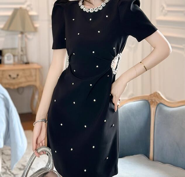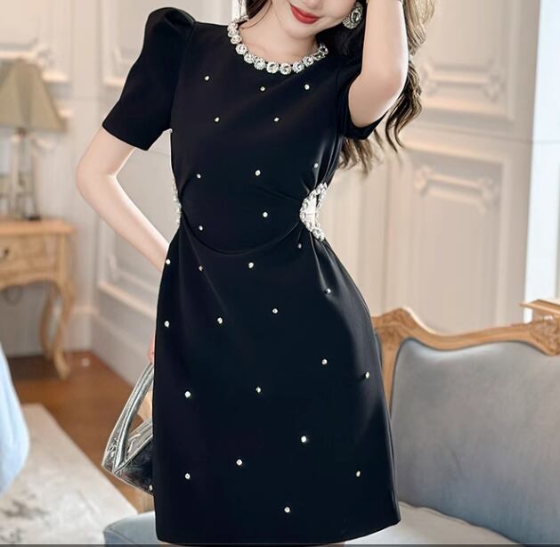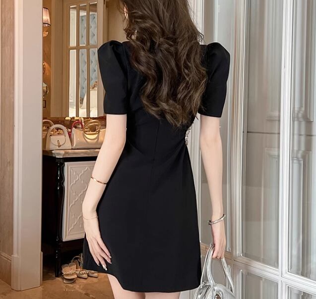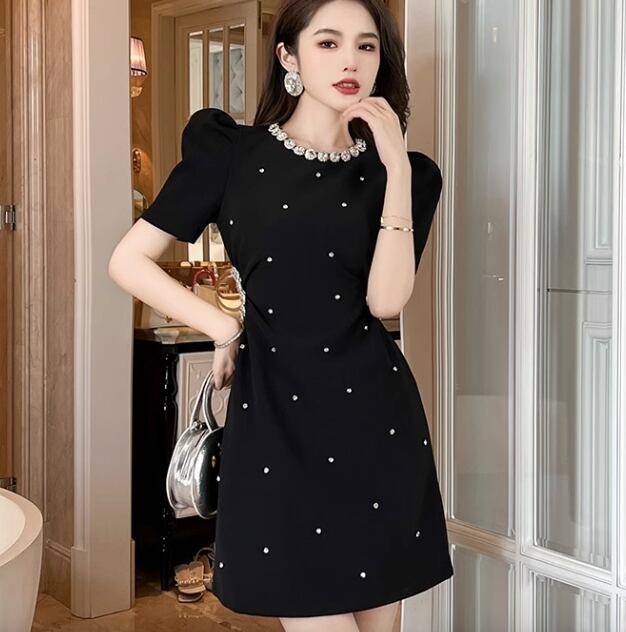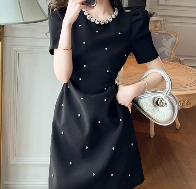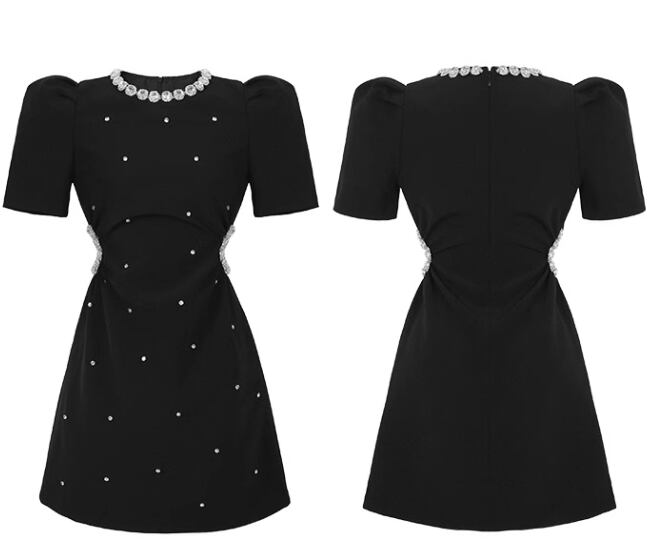 レディース ワンピース ドレス ミニ 膝上 半袖 パワーショルダー ラウンドネック 襟なし Aライン フェミニン ハイウエスト ビジュー かわいい 大人可愛い 上品 おしゃれ ガーリー 存在感 クラシカル ロマンティック 華やか 無地 夏 二次会 お呼ばれ デート お出かけ パーティー イベント レストラン ホテル ガーデン ショッピング 美脚 脚長 モテ トレンド スタイルアップ 肌見せ S M L XL 黒 ブラック