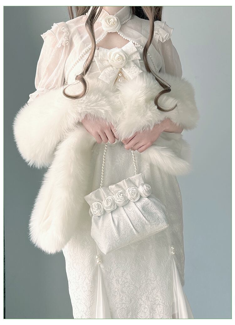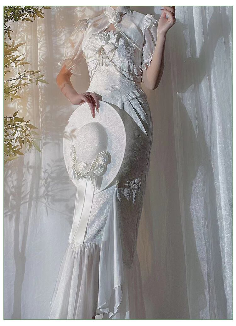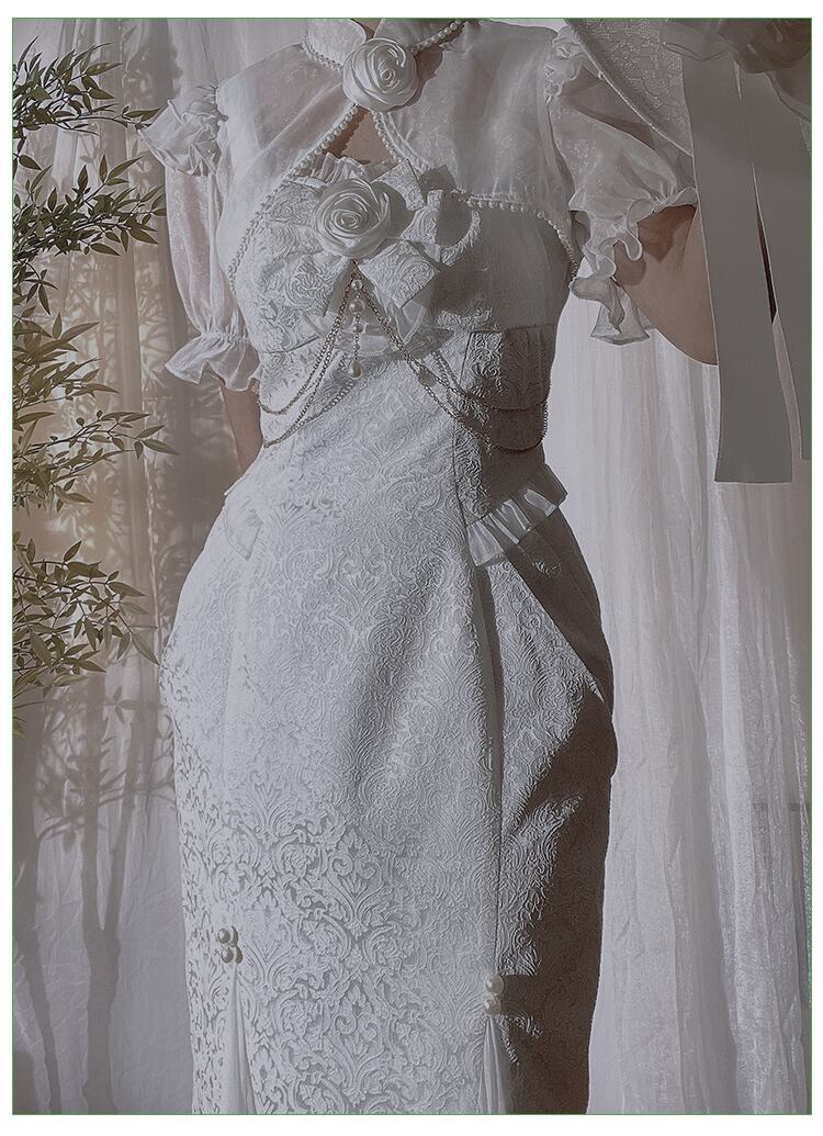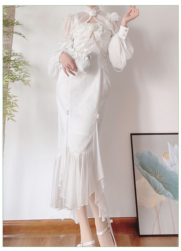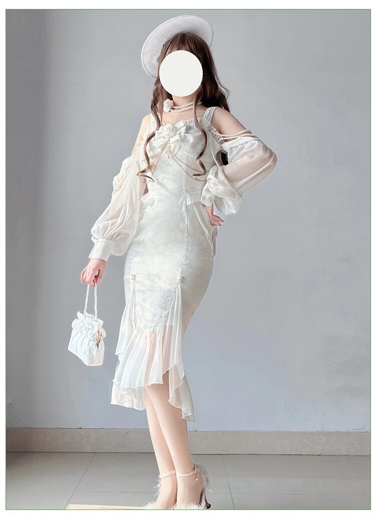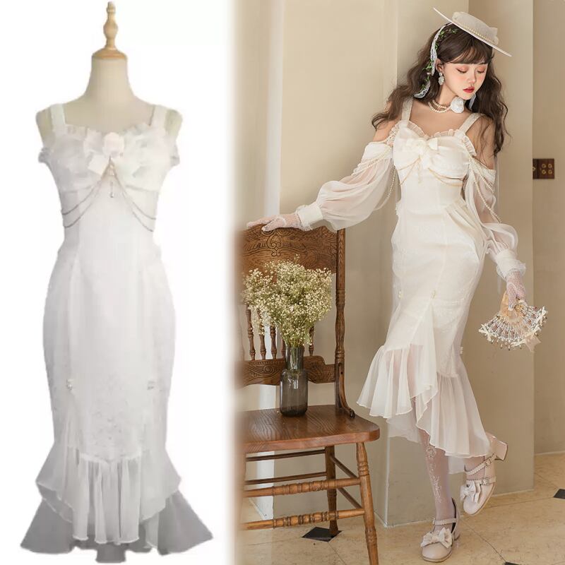 可憐でエレガントなロマンティックドレス!ドレス単品と3タイプのセットアップからお選びいただけます。ミモレ丈のマーメイドドレスは、フリルやリボンがふんだんにあしらわれたフェミニンなデザイン。ホワイトのカラーが純粋でエレガントな雰囲気を演出し、チェーンやパールビーズの繊細なきらめきがアクセントに。アームドレスやボレロを合わせれば、クラシカルかつ華やかなスタイルが完成します。春夏秋のパーティーシーンやロリータコーデに最適です。