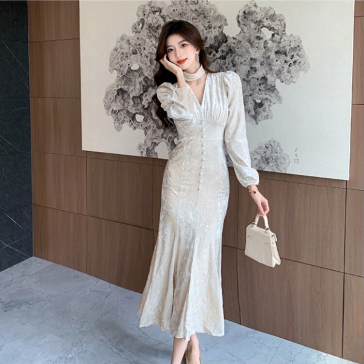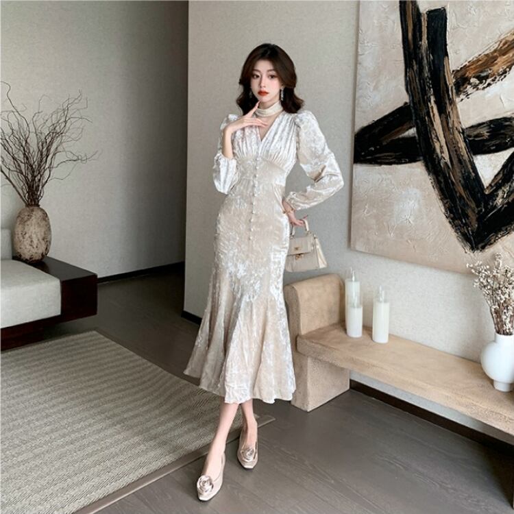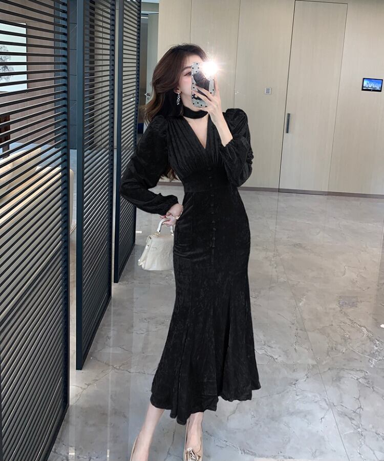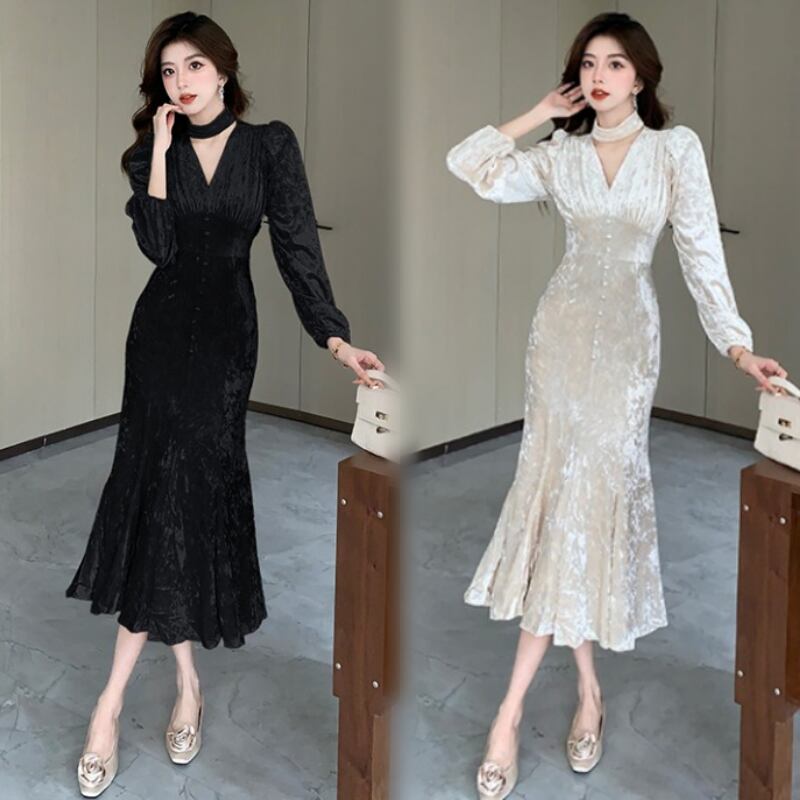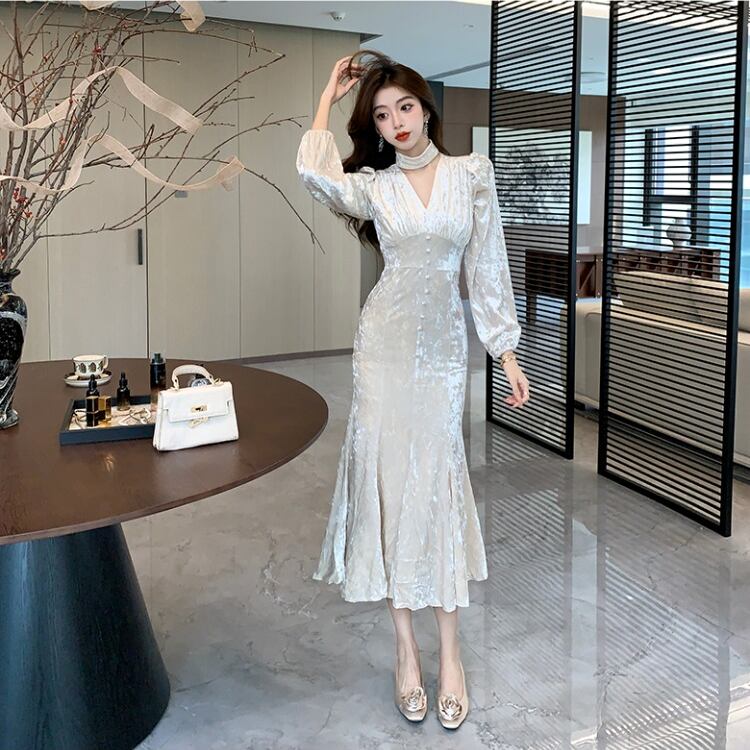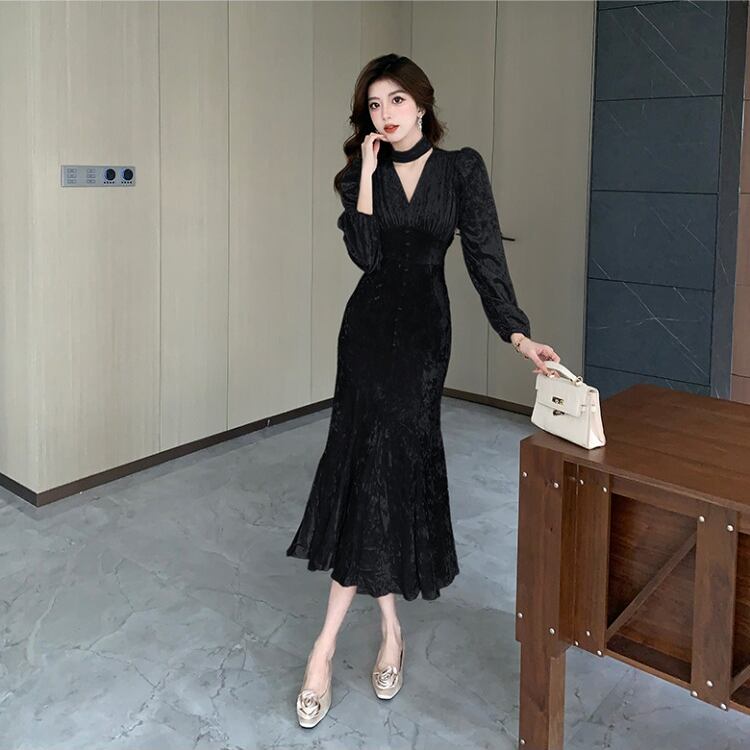 レディース ワンピース ドレス ミモレ ロング 長袖 ペザントスリーブ Vネック チョーカーネック フレア タイト スリム 細身 マーメイド フェミニン スレンダー ハイウエスト ベロア ベルベット かわいい 大人可愛い きれいめ シンプル 上品 おしゃれ エレガント 主役級 存在感 抜け感 キュート 都会的 ラグジュアリー ロマンティック シック 華やか 無地 秋 冬 謝恩会 二次会 披露宴 同窓会 お呼ばれ お出かけ イベント ホテル 清楚 スタイルアップ S M L XL ブラック 光沢 シャンパン