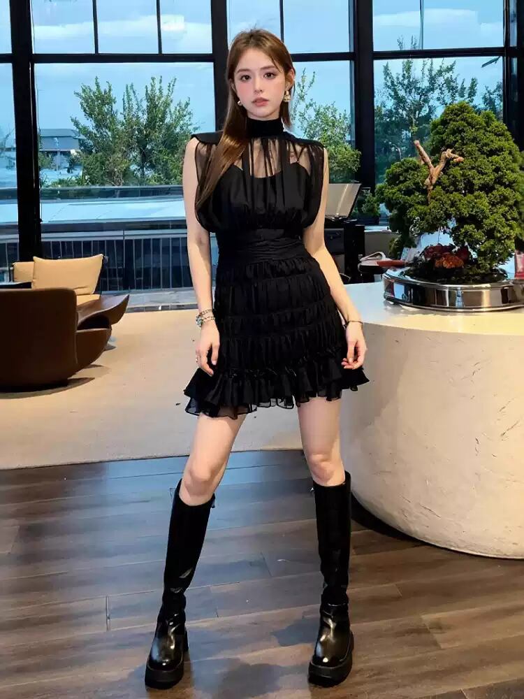 レディース ワンピース ドレス ミニ ショート 袖なし ノースリーブ ハイネック モックネック セミフレア Aライン ティアード シフォン フリル ハイウエスト 透け感 シースルー フラウンス シアー かわいい シンプル 上品 おしゃれ ガーリー エレガント 抜け感 ラブリー キュート ゴシック プリンセス 都会的 ロマンティック セクシー 色気 華やか 可愛い 春 夏 デート お出かけ パーティー 女子会 クラブ キャバ ラウンジ 普段使い 清楚 スタイルアップ S M L XL 黒 ブラック