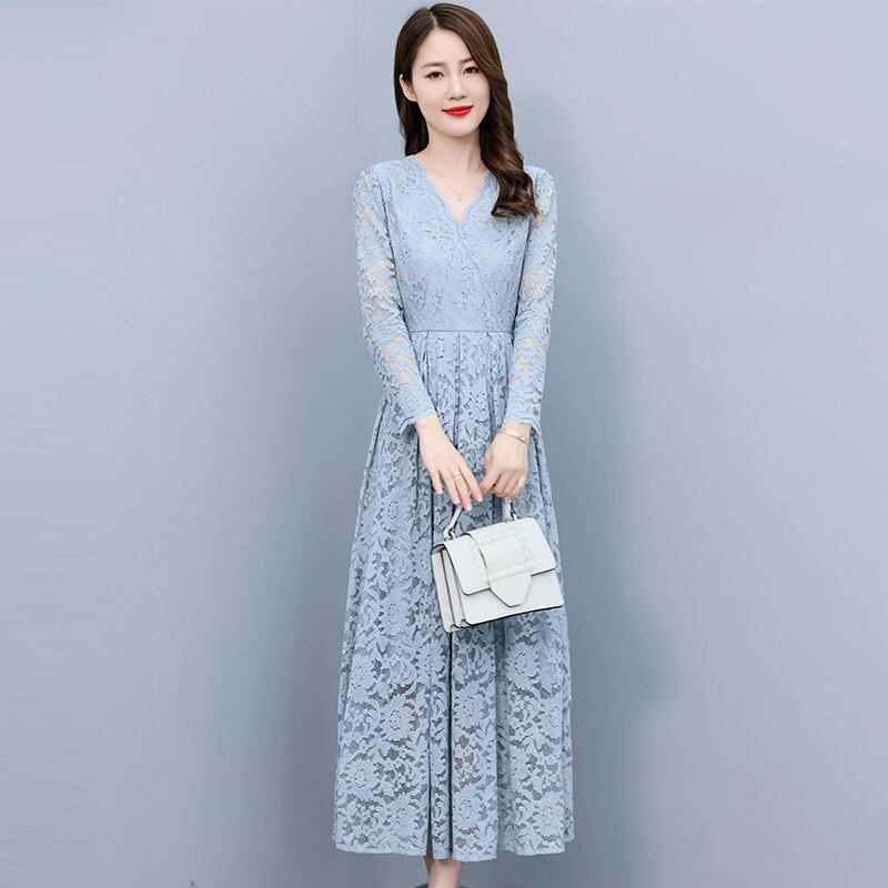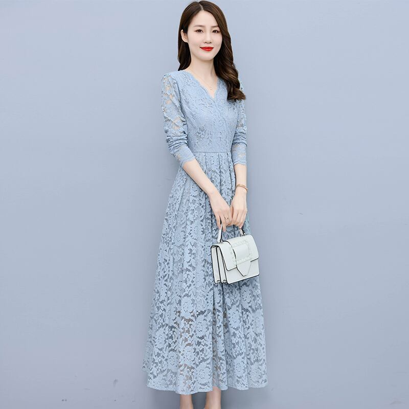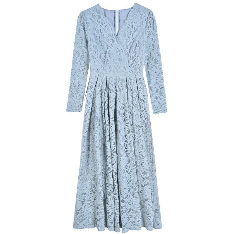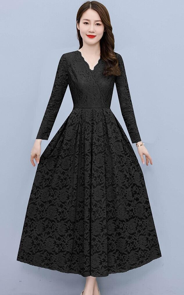 レディース ワンピース ロングスカート レーススカート 膝下 ロング 長袖 Vネック セミフレア タイト スリム タック レース ファスナー ハイウエスト 大人可愛い きれいめ カジュアル 上品 おしゃれ エレガント 総柄 春 夏 秋 冬 オールシーズン パーティー イベント リゾート 旅行 女子会 休日 バカンス ショッピング 発表会 コンサート 韓国 コーデ 楽ちん 体型カバー 脚長 モテ 清楚 スタイルアップ 涼しい M L XL 2XL 3XL 黒 ブラック グレー ベーシックカラー 大人カラー