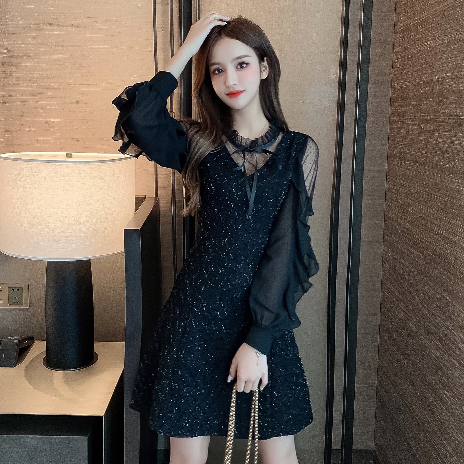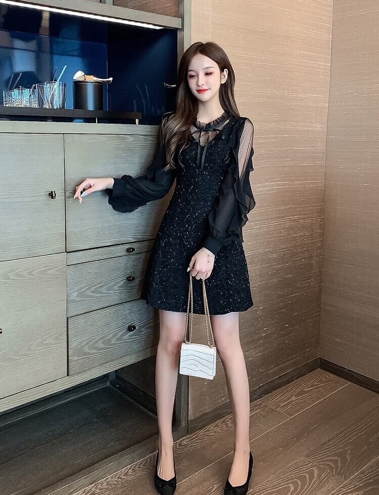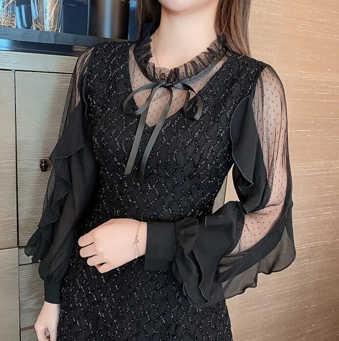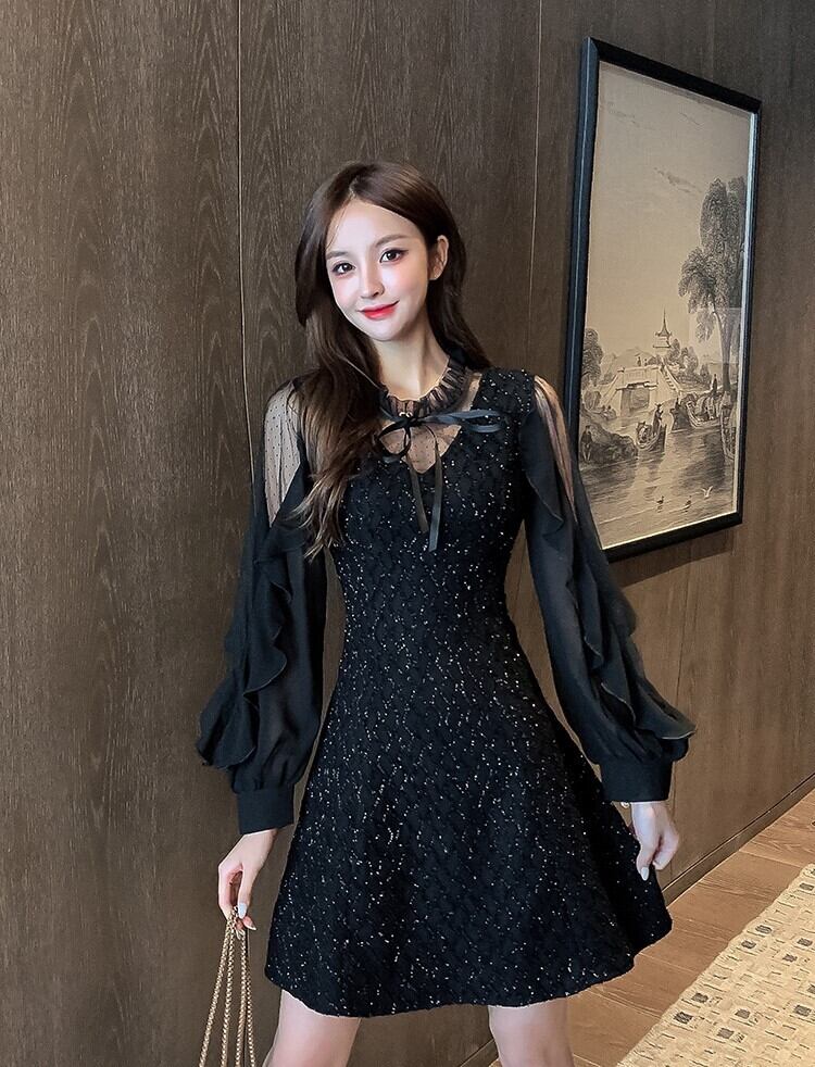 レディース ワンピース ドレス ミニスカート ショート 膝上 長袖 フリル袖 襟付き スリム Aライン フリル リボン ファスナー 透け感 シースルー かわいい 大人可愛い カジュアル おしゃれ こなれ感 ラブリー キュート ロマンティック ナチュラル セクシー 色気 総柄 秋 冬 デート お出かけ パーティー イベント レストラン 女子会 休日 発表会 コンサート コーデ 楽ちん 美脚 脚長 モテ 清楚 スタイルアップ 肌見せ S M L XL 2XL 3XL 黒 ブラック ベーシックカラー 大人カラー