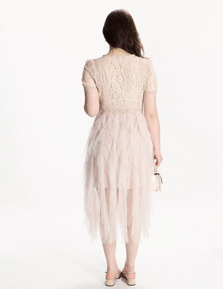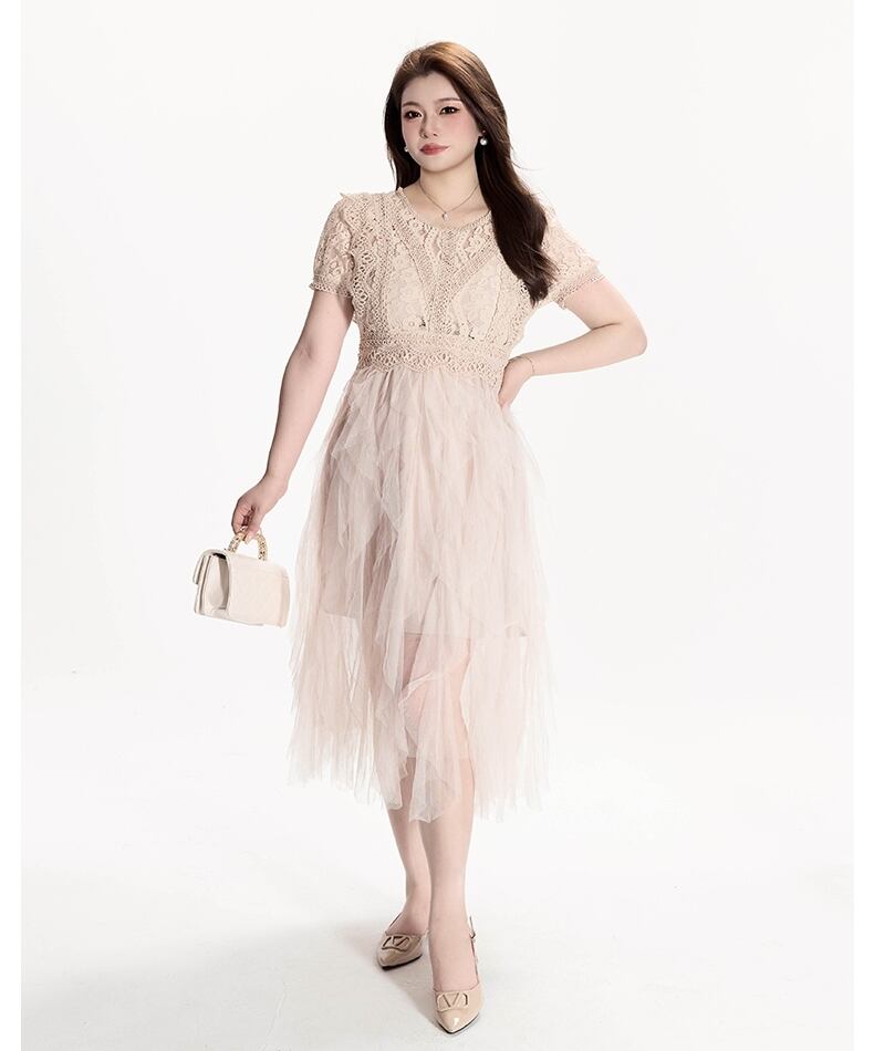 レディース ワンピース ミモレ 半袖 ラウンドネック フレア フェミニン レース チュール ハイウエスト 透け感 シースルー 切り替えデザイン シアー かわいい 大人可愛い きれいめ シンプル 上品 おしゃれ こなれ感 ガーリー エレガント 抜け感 ラブリー キュート 都会的 ロマンティック シック 爽やか 華やか 可愛い 花柄 フラワー 春 夏 デート お出かけ レストラン ガーデン 普段使い モテ 清楚 スタイルアップ 2XL 3XL 4XL 5XL 大きいサイズ ビッグ プラスサイズ アプリコット