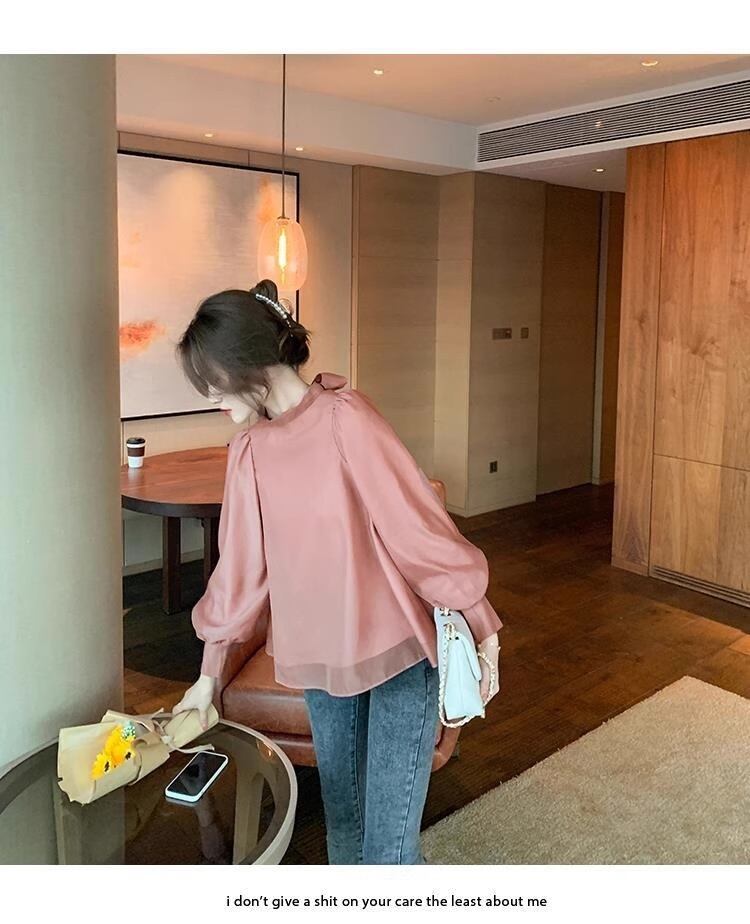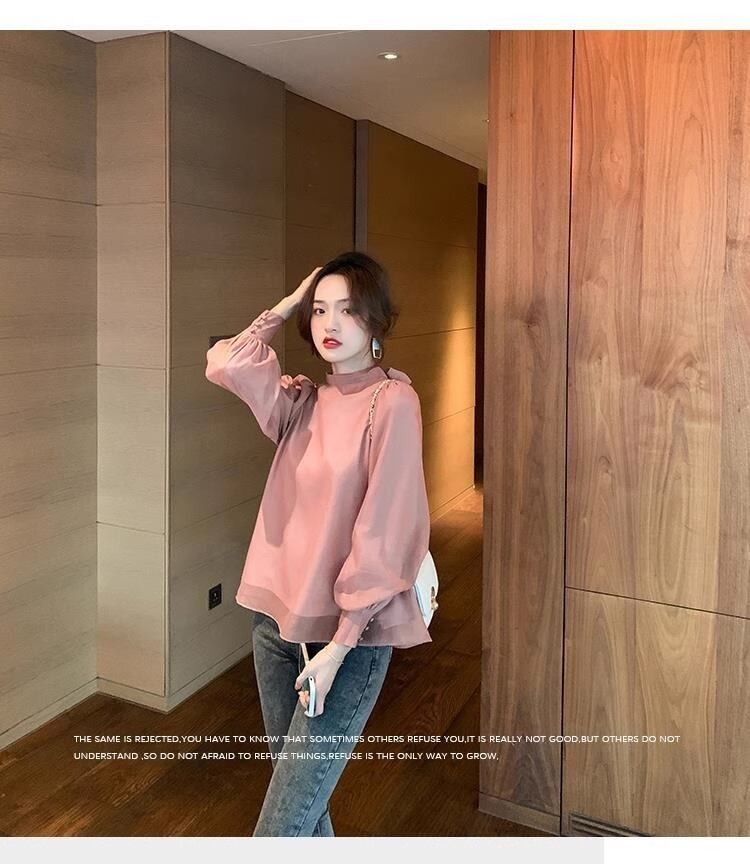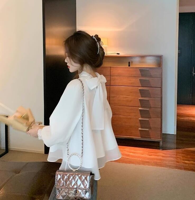 エレガントな雰囲気をプラスする、長袖シフォンシャツです!パフスリーブとスタンドカラーが魅力的なこのシャツは、春夏秋冬いつでも着こなせるアイテム。リボン付きのバックデザインが可愛らしさを演出し、大人可愛いスタイルを実現します。シンプルかつ上品なデザインは、入学式や謝恩会、デート、お出かけなど、様々なシーンにぴったりです!