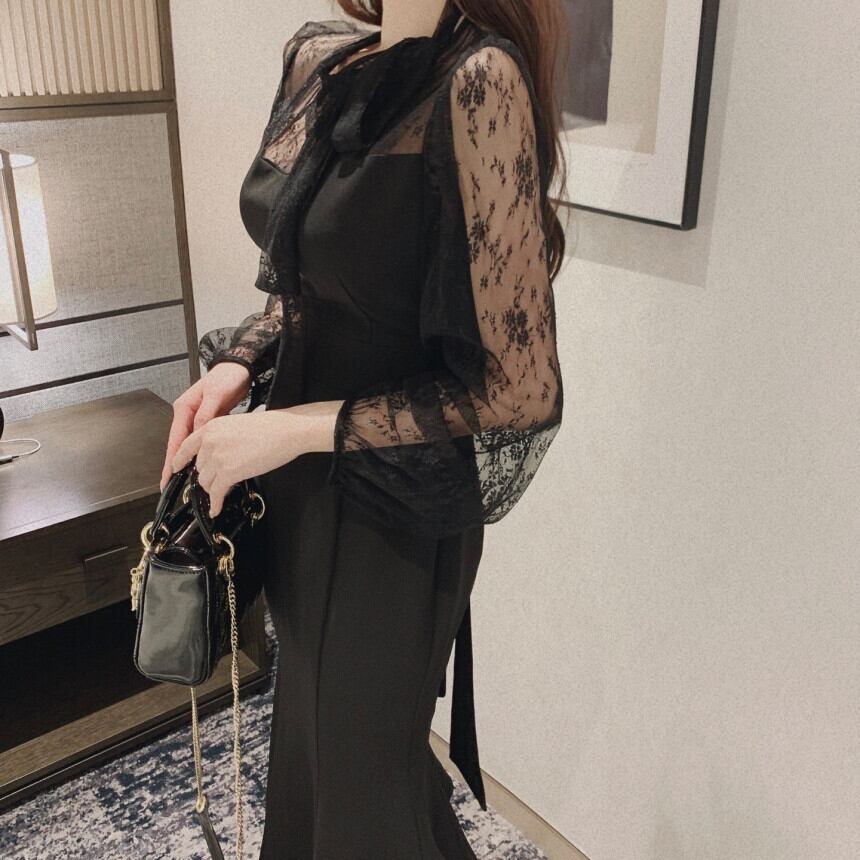レディース ワンピース ドレス マーメイドスカート 膝下 ミモレ 長袖 Uネック タイト スリム 細身 切り替え レース リボン ウエストマーク バックリボン ファスナー ハイウエスト 透け感 大人可愛い きれいめ シンプル 上品 おしゃれ こなれ感 エレガント 主役級 存在感 キュート ナチュラル セクシー 色気 無地 春 秋 デート お出かけ パーティー イベント レストラン 女子会 ホテル 発表会 コンサート 脚長 モテ 清楚 スタイルアップ S M L 黒 ブラック ピンク 大人カラー 秋カラー