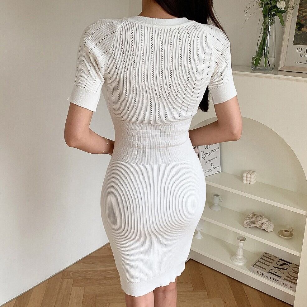 レディース ワンピース ニットワンピ 膝丈 膝上 ミディ ミドル 半袖 スクエアネック 襟なし ノーカラー タイト スリム 細身 スマート ウエストマーク ハイウエスト 伸縮性 切り替えデザイン 飾りボタン 大人可愛い きれいめ シンプル カジュアル おしゃれ こなれ感 エレガント 抜け感 都会的 セクシー 色気 センシュアル 無地 春 夏 デート お出かけ イベント リゾート 旅行 休日 合コン コンパ クラブ キャバ 韓国 オルチャン コーデ 脚長 普段使い 小さいサイズ ワンサイズ 白 ホワイト