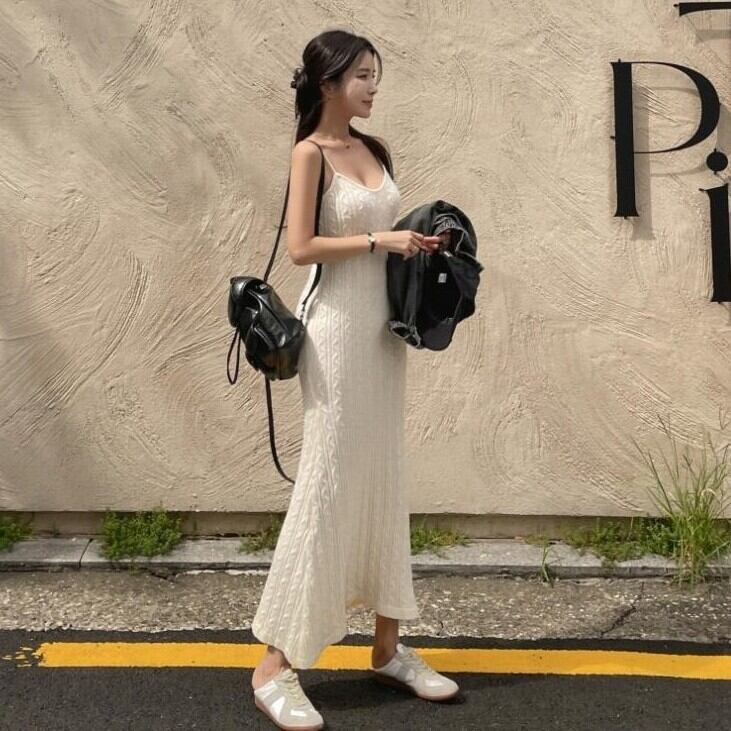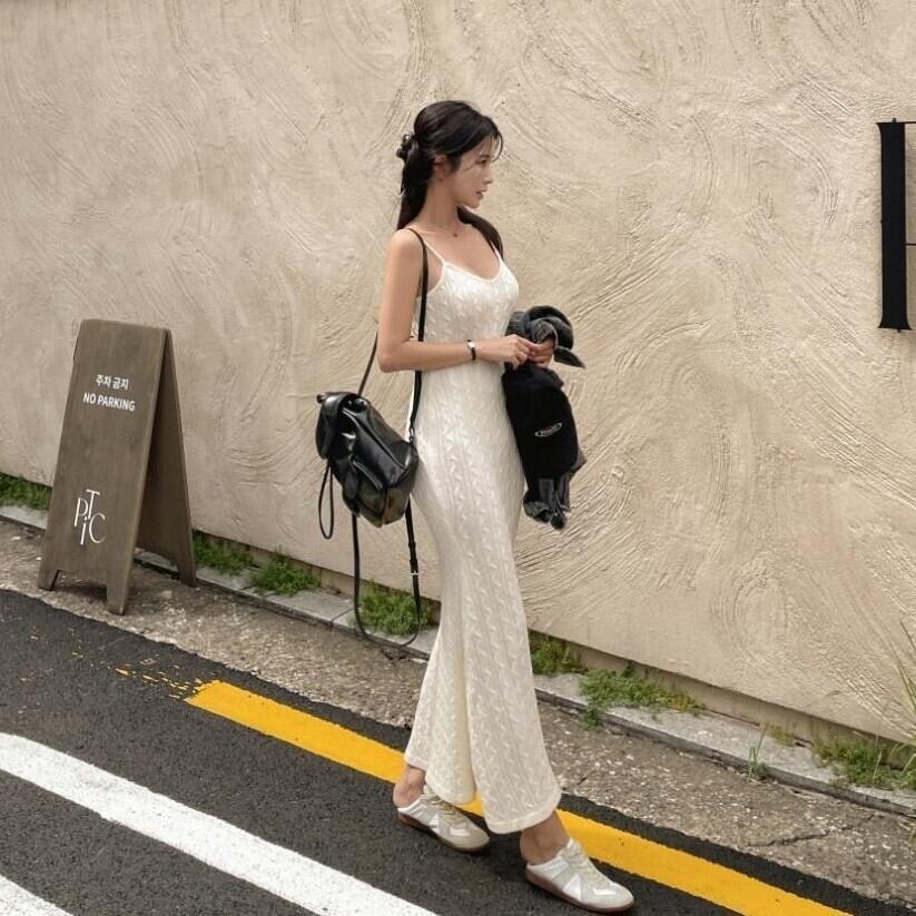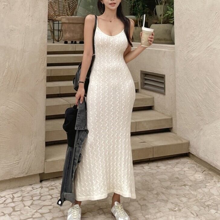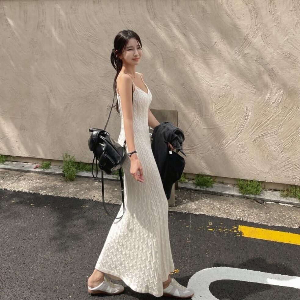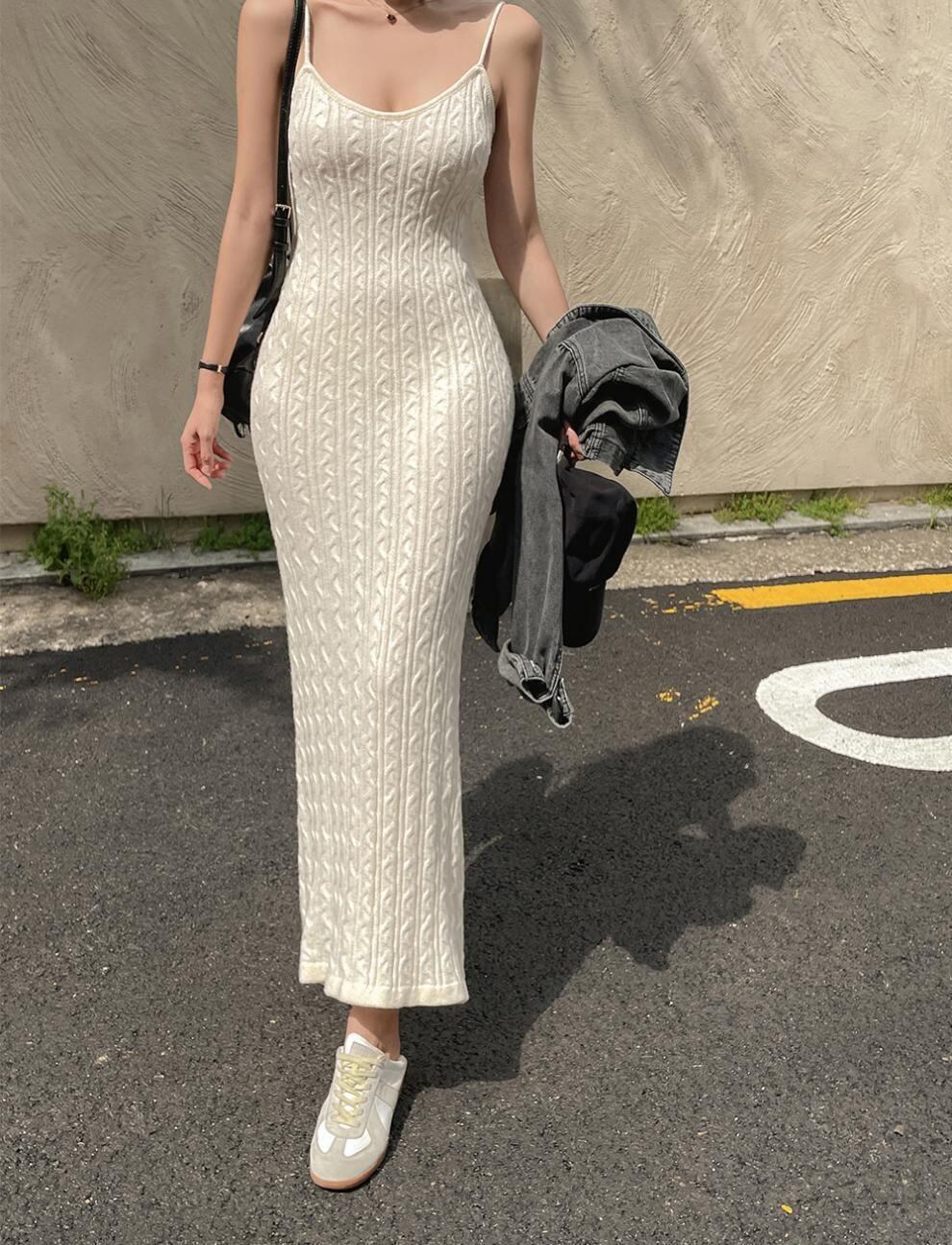 サスペンダードレス レディース ワンピース ニットワンピ キャミワンピ ロング マキシ 袖なし ノースリーブ Uネック 襟なし タイト スリム 細身 マーメイド フェミニン 伸縮性 大人可愛い きれいめ シンプル カジュアル おしゃれ こなれ感 抜け感 ナチュラル セクシー 色気 センシュアル ケーブル柄 夏 デート お出かけ イベント リゾート 旅行 ビーチ 休日 バカンス ショッピング 合コン 韓国 オルチャン コーデ 普段使い モテ 小さいサイズ ワンサイズ 白 ホワイト 黒 ブラック ダークグレー