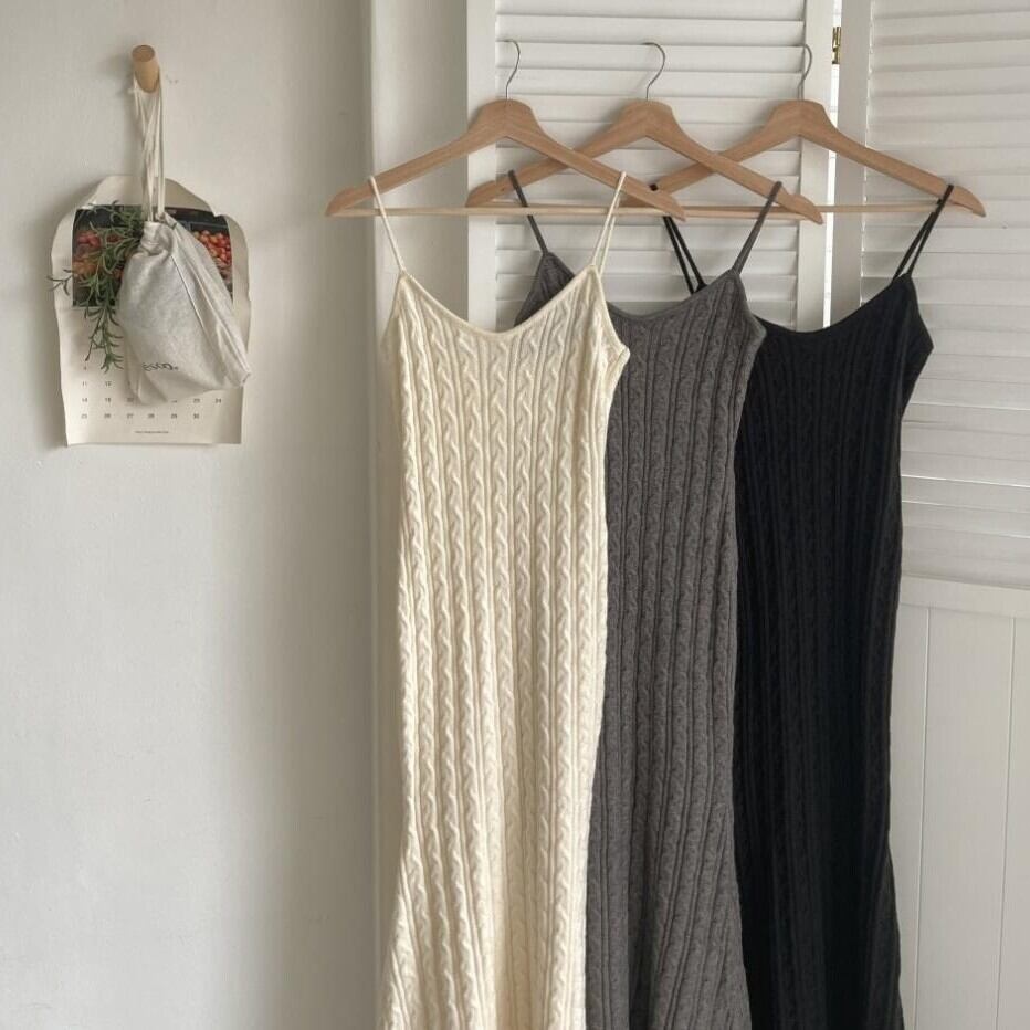 シンプルでいてフェミニンな魅力を引き立てる、ケーブル編み柄のニットキャミソールワンピースです!