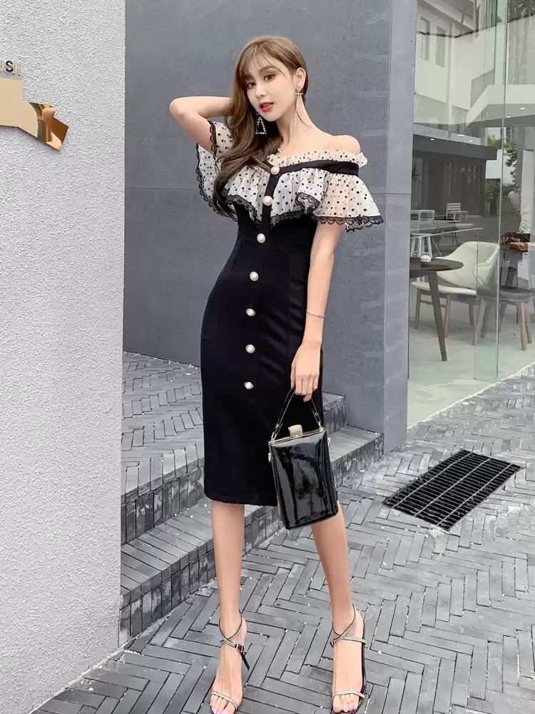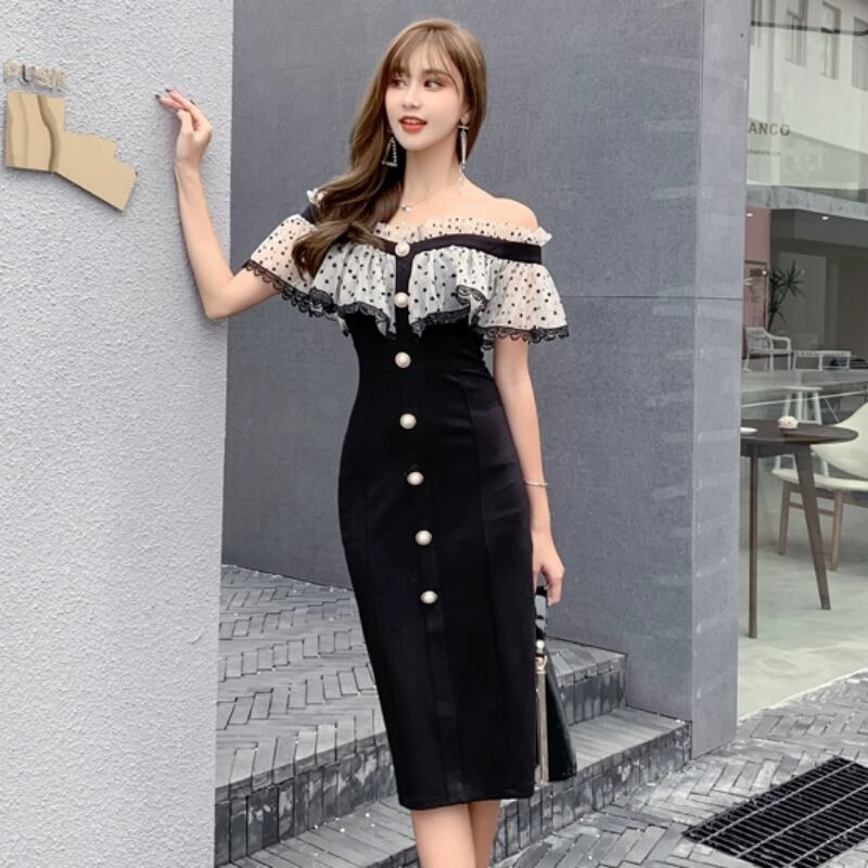 レディース ワンピース 膝丈 膝下 ミディ 半袖 オフショルダー タイト スリム 細身 スキニー ボディコンシャス スレンダー アワーグラスライン レース シフォン フリル バックスリット 透け感 シースルー 飾りボタン シアー ストレッチ 伸縮性 かわいい 大人可愛い きれいめ 上品 おしゃれ ガーリー エレガント ラブリー キュート 都会的 ロマンティック セクシー 色気 シック 華やか 可愛い ドット柄 水玉 春 夏 デート お出かけ パーティー S M L 黒 ブラック バイカラー モノトーン