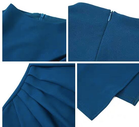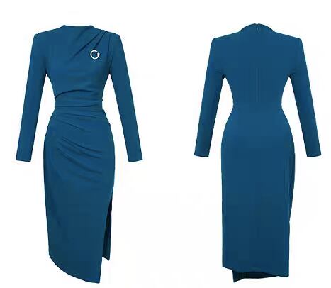 レディース ワンピース ドレス 膝下 ロング 長袖 ボトルネック 襟付き タイト スリム 細身 スマート フェミニン アワーグラスライン タック サイドスリット ファスナー ハイウエスト コンサバ きれいめ シンプル 上品 おしゃれ かっこいい クール エレガント 都会的 ラグジュアリー 色気 シック 無地 春 秋 二次会 同窓会 お呼ばれ ママ デート お出かけ パーティー レストラン ホテル 発表会 美脚 脚長 スタイルアップ S M L ブルー 大人カラー