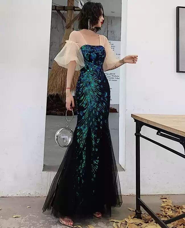 華やかでエレガントなデザインのイブニングドレスが登場です!マキシ丈とボリュームのある袖が魅力的で、スクエアネックが美しいデコルテラインを引き立てます。タイトなシルエットとマーメイドラインが身体のラインを美しく強調し、シックでセクシーな印象を与え、パーティーや特別な場面で主役となれる存在感を放ちます。