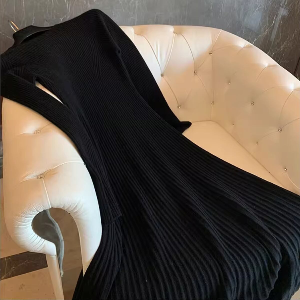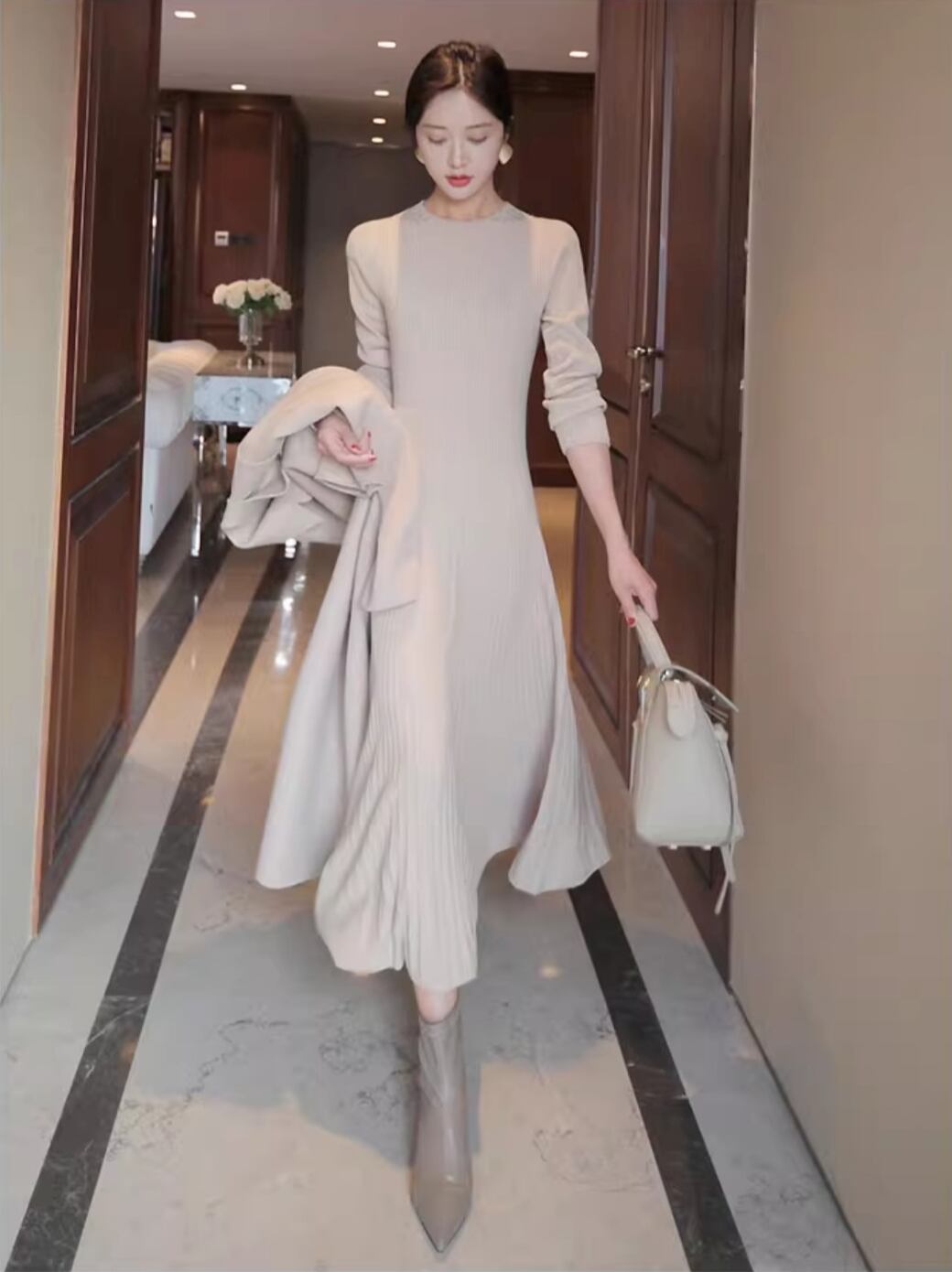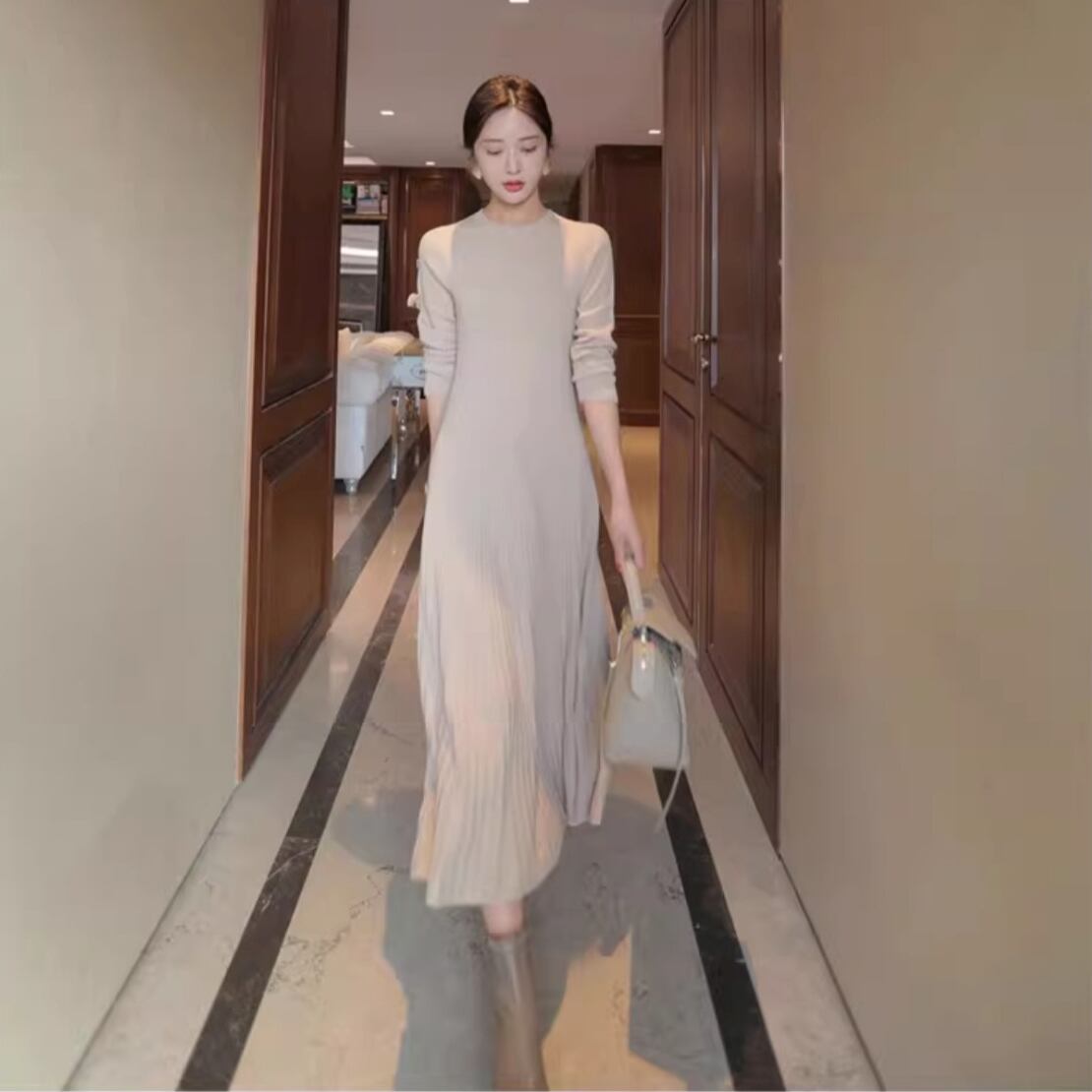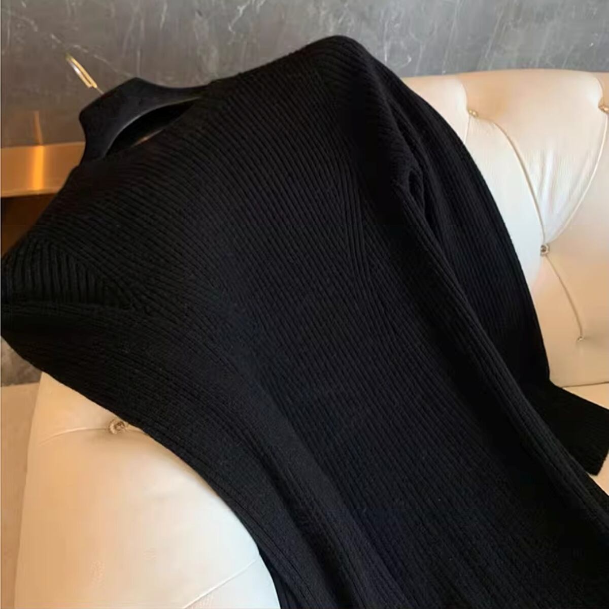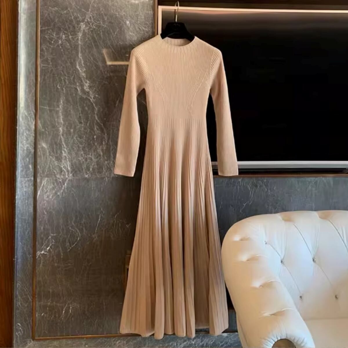 洗練された大人の魅力を引き出す、シンプルなリブニットのフレアワンピースです!ミモレ丈、長袖のデザインは、秋冬の季節にぴったり。クルーネックの首回りが上品で、エレガントな雰囲気を醸し出します。ストレッチ性のある素材は、柔らかく肌触りも良く、普段使いからデートシーンまで幅広く活躍します。