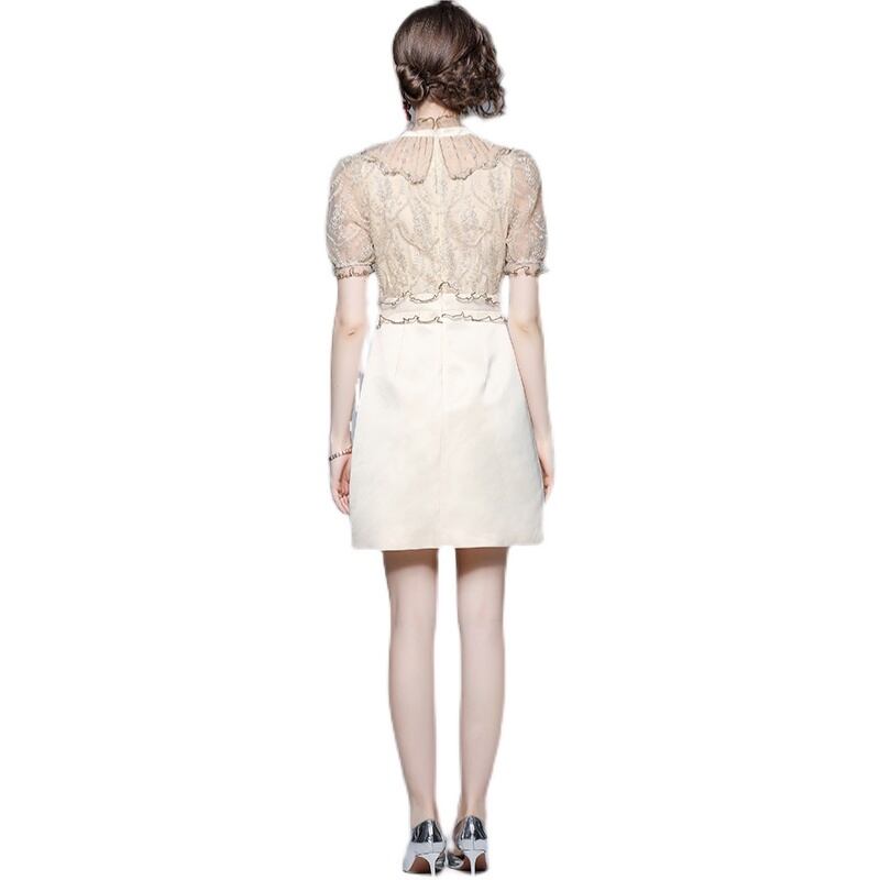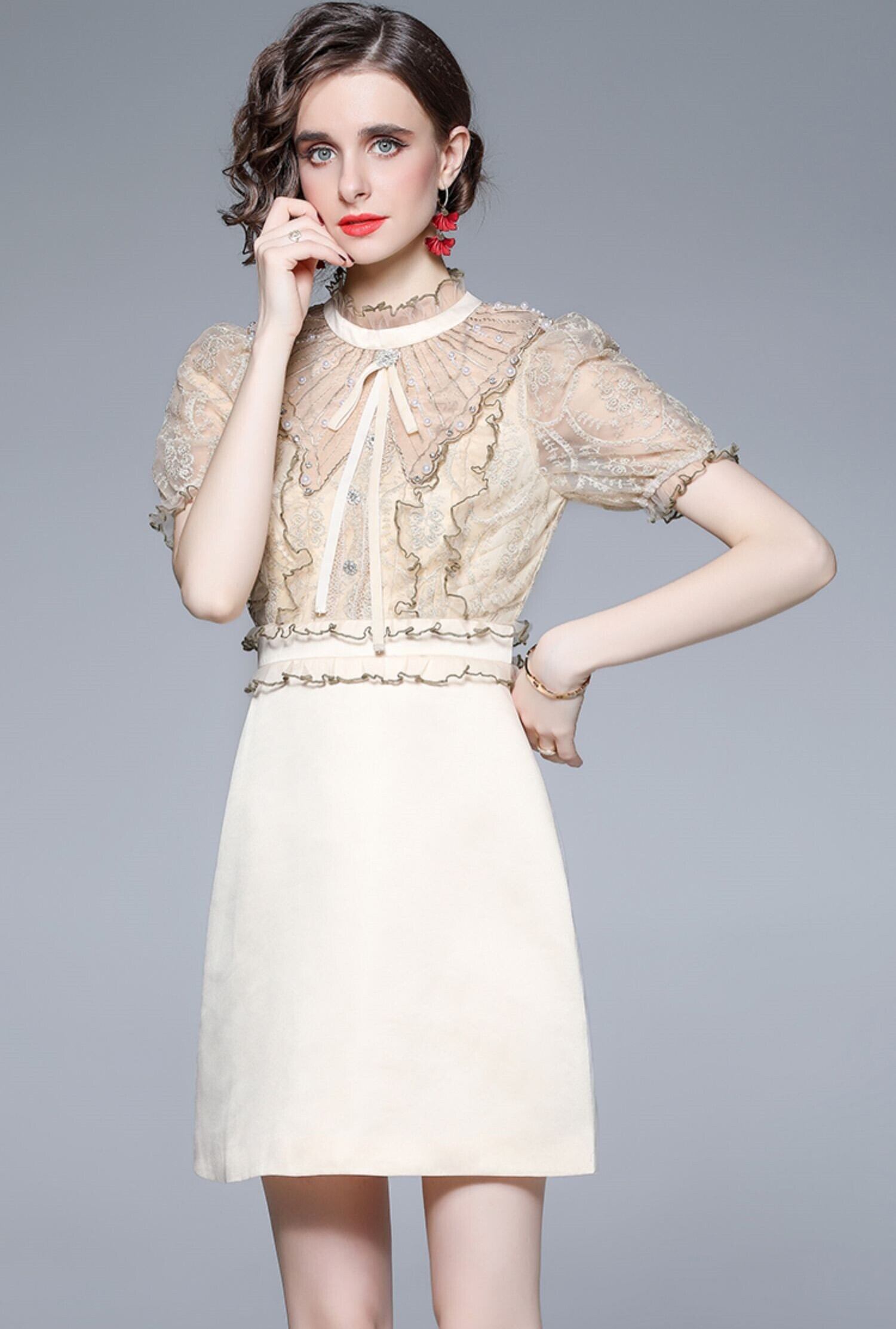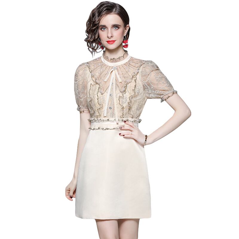 レディース ワンピース ミニ ショート 膝上 半袖 ハイネック タイト スリム 細身 切り替え レース フリル リボン ウエストマーク ハイウエスト 透け感 かわいい 大人可愛い きれいめ カジュアル 上品 おしゃれ こなれ感 エレガント セクシー 色気 可愛い 春 夏 デート お出かけ パーティー イベント レストラン 女子会 休日 ホテル ガーデン ショッピング 発表会 コンサート コーデ 楽ちん 美脚 脚長 スタイルアップ コスチューム S M L XL 2XL アプリコット 大人カラー 春カラー