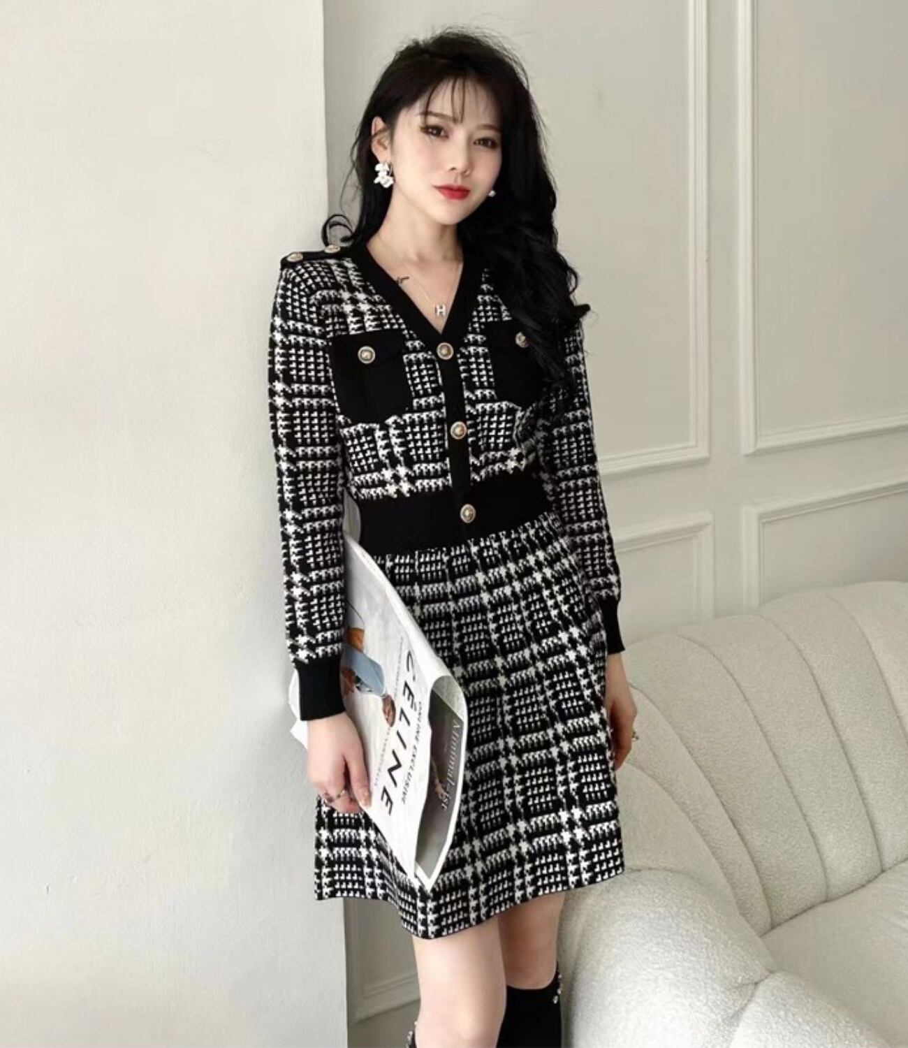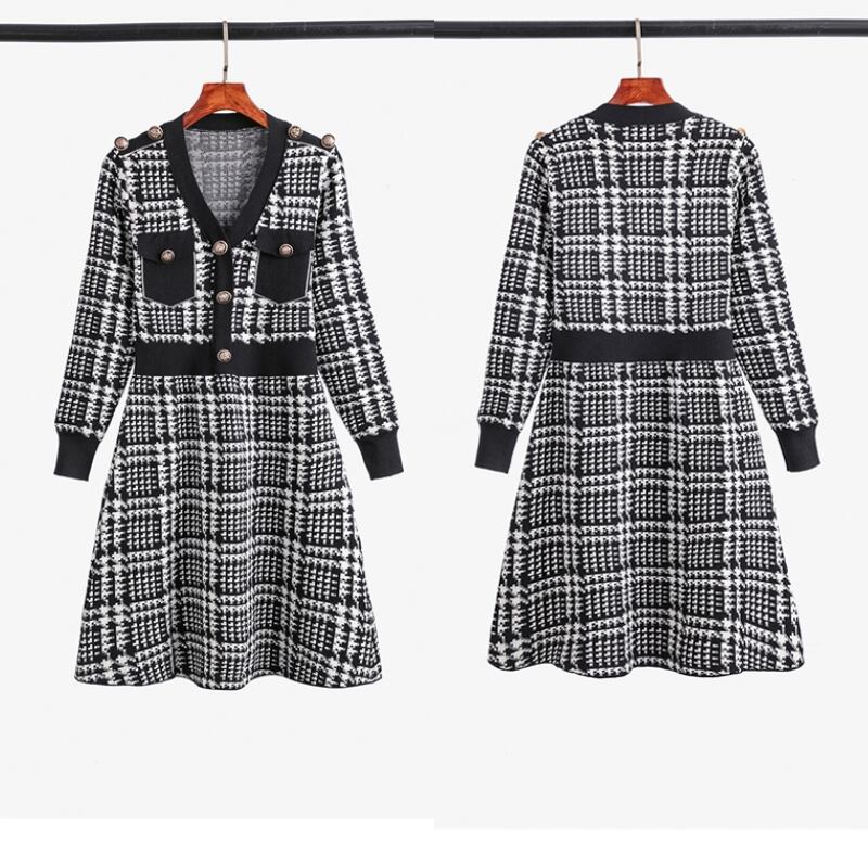 レディース ワンピース ニットワンピ セータードレス ミニ ショート 長袖 Vネック フレア Aライン ウエストマーク ハイウエスト バイカラー 飾りボタン ハイゲージ かわいい 大人可愛い きれいめ 上品 おしゃれ レトロ エレガント キュート 都会的 プレッピー シック ノーブル 華やか 可愛い グレンチェック 春 秋 冬 デート お出かけ レストラン 女子会 ショッピング コンパ 韓国 オルチャン 普段使い トレンド スタイルアップ 高見え S M L XL ブラック レッド