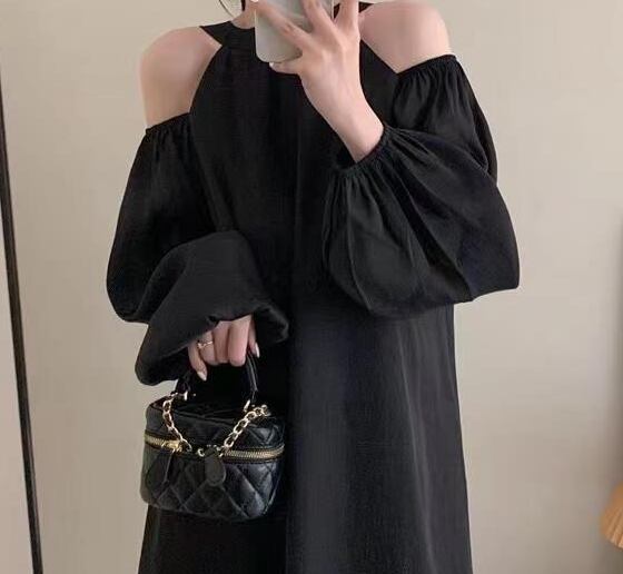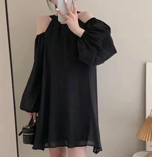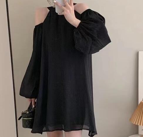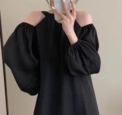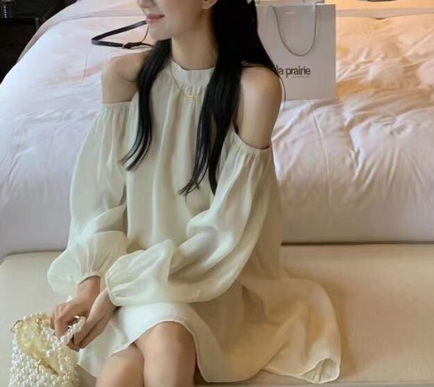 オープンショルダーとバルーン袖がほど良い肌見せを演出し、上品さと女性らしさを兼ね備えています。