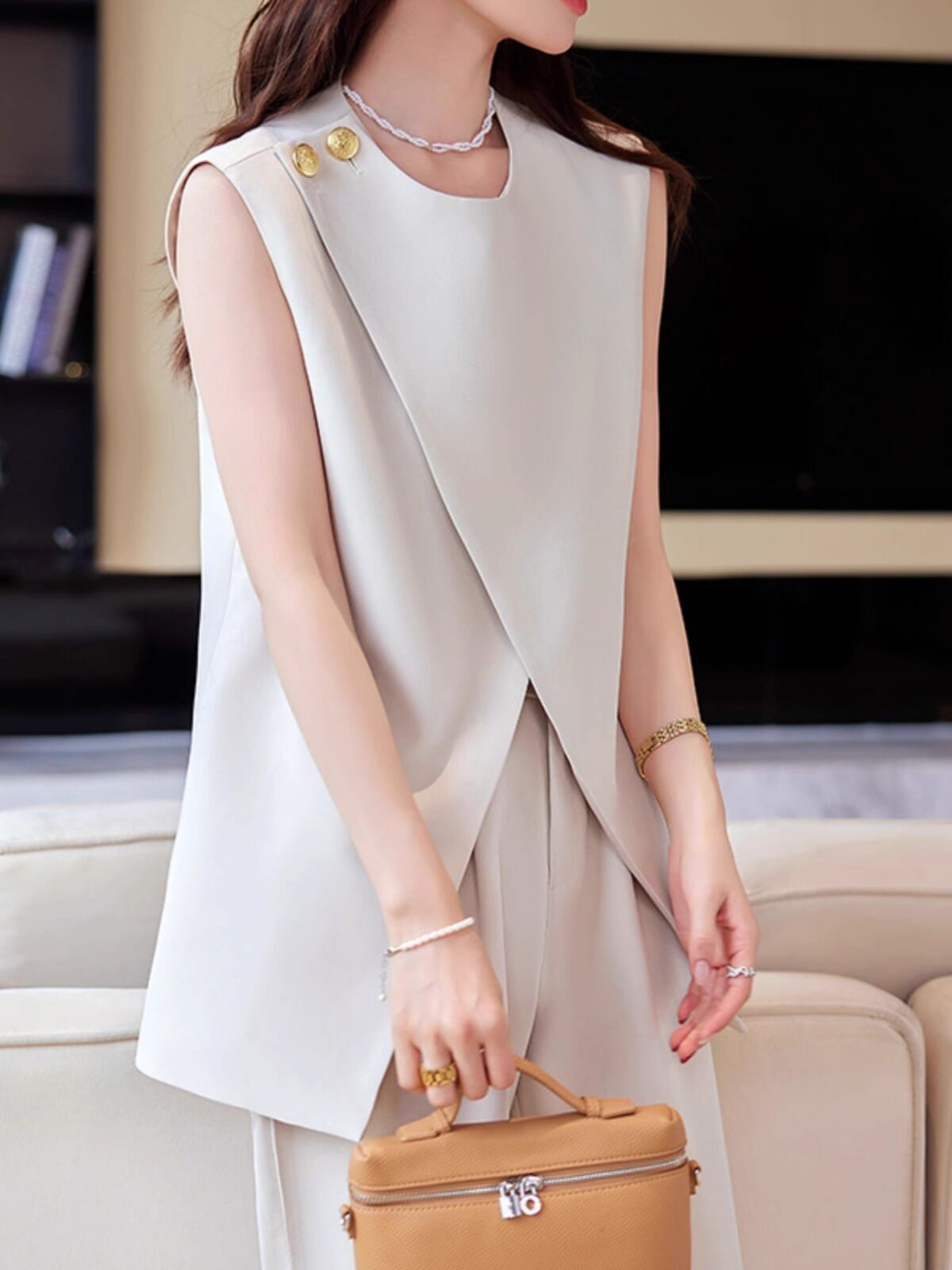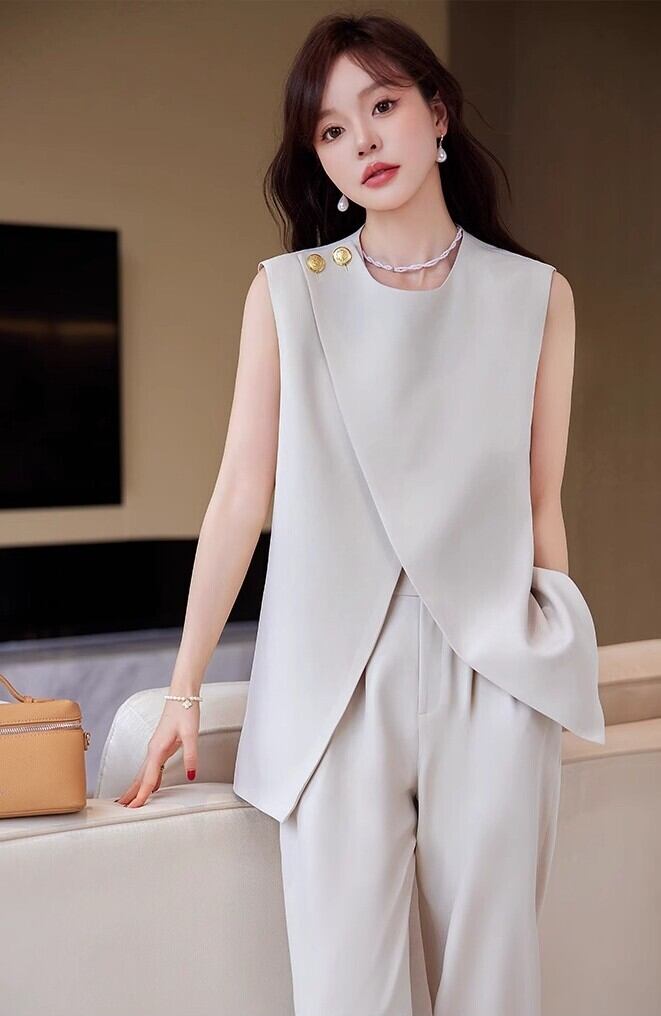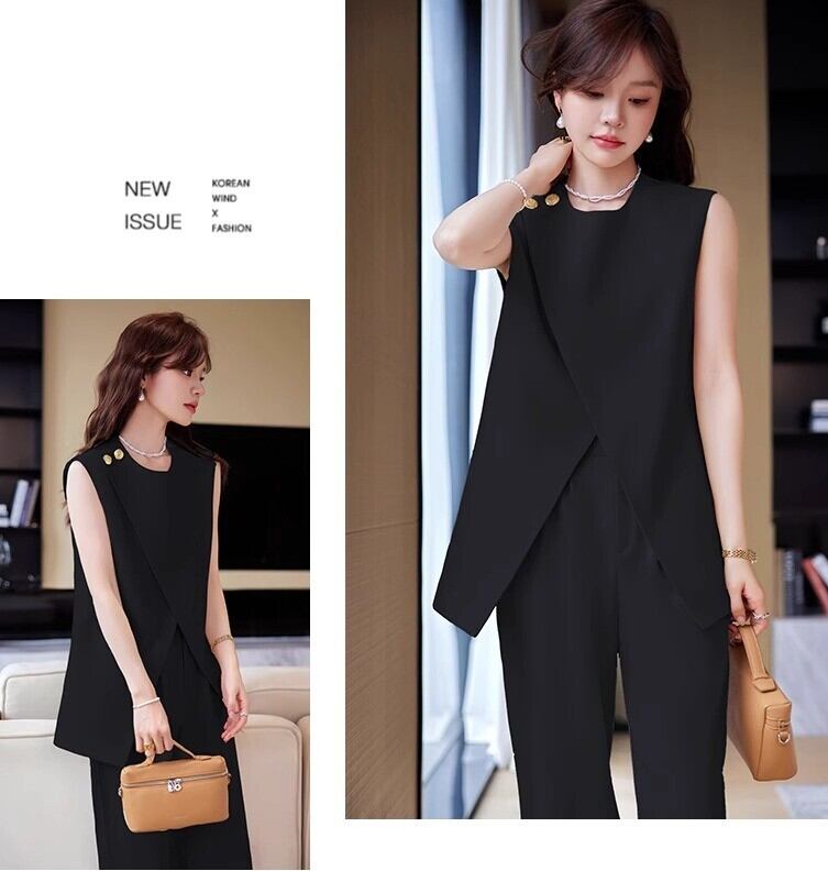 レディース トップス パンツ ボトムス ベスト スーツ セットアップ ミディアム ロング 袖なし ラウンドネック 襟なし ノーカラー Aライン アシンメトリー タック サイドボタン コンサバ ボタン 飾りボタン きれいめ シンプル 上品 エレガント 抜け感 都会的 ラグジュアリー 清潔感 クリーン 無地 ワンポイント 夏 演奏会 同窓会 お呼ばれ ママ オフィス ビジネス OL 通勤 コンサート 体型カバー 脚長 定番 スタイルアップ S M L XL 2XL 大きいサイズ 黒 ブラック ベージュ