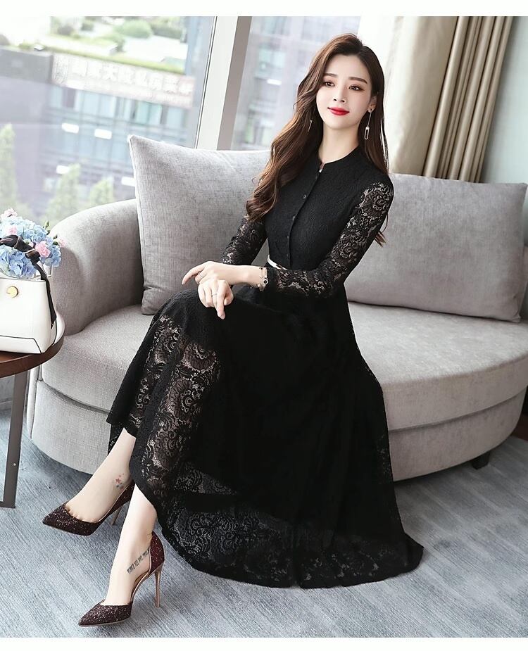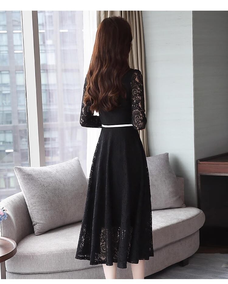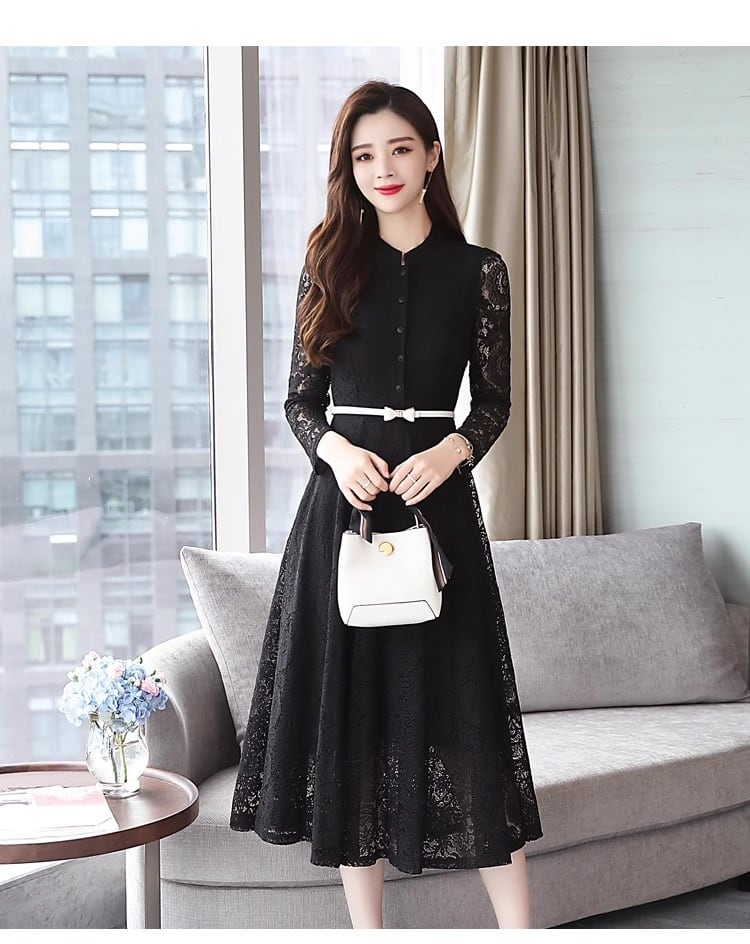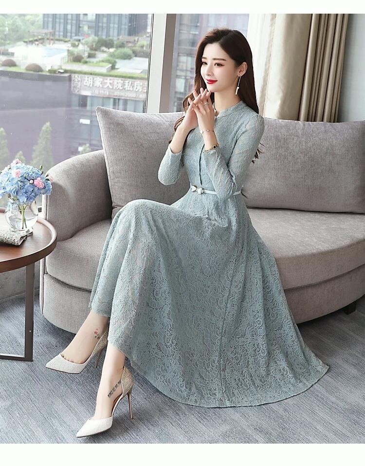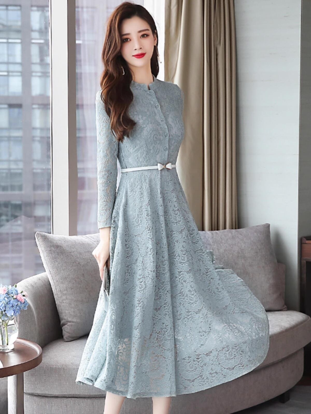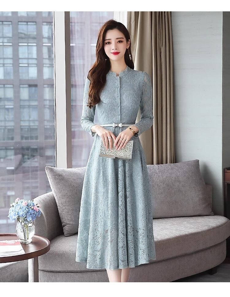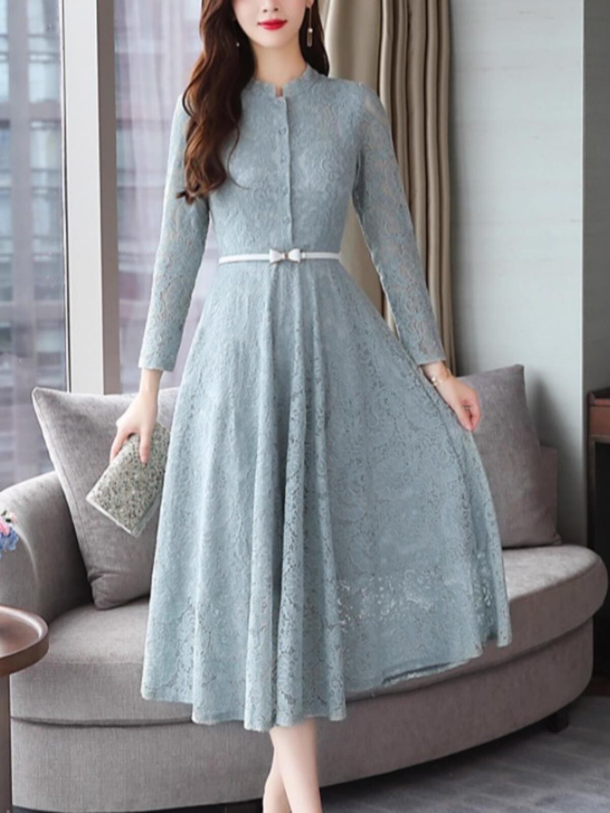 長袖ワンピース レディース スカート ワンピース ドレス フレンチスカート 膝下 ロング 長袖 スタンドカラー フレア セミフレア Aライン レース リボン ベルト ウエストリボン ふわふわ ボタン 総レース かわいい 大人可愛い きれいめ シンプル 上品 ガーリー 華やか 清潔感 春 秋 冬 誕生日 結婚式 二次会 クリスマス 同窓会 お呼ばれ デート パーティー リゾート レストラン 女子会 休日 コンサート 合コン 脚長 モテ 清楚 トレンド M L XL 2XL 3XL ブラック グレー ブルー