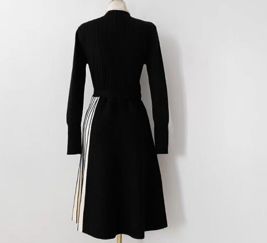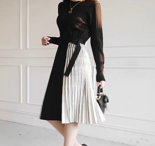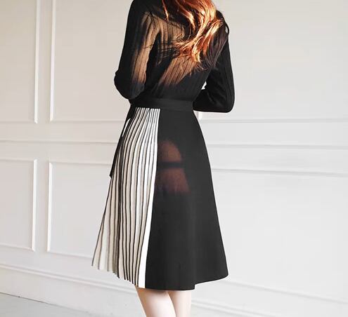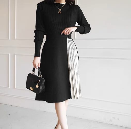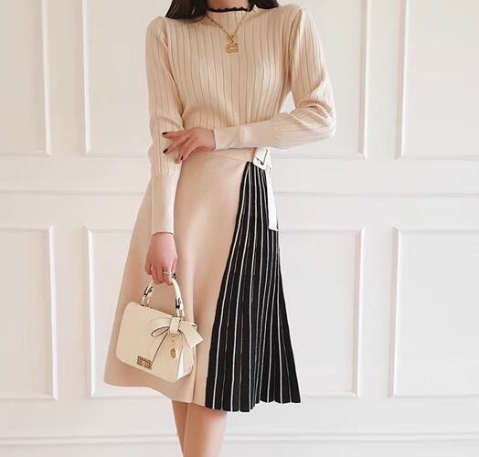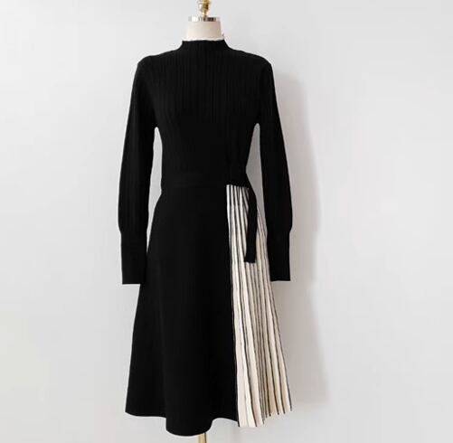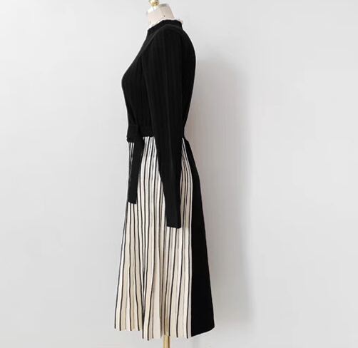 レディース ワンピース ニットワンピ 膝下 ミモレ ミディ ミドル 長袖 ハイネック セミフレア ドッキング フェミニン Xライン プリーツ タック タックプリーツ ベルト ウエストマーク ハイウエスト リブ 切り替えデザイン バイカラー 配色 きれいめ 上品 おしゃれ かっこいい モード系 エレガント モダン 存在感 無地 ストライプ 秋 冬 春 授業参観 ミーティング ママ オフィス OL お出かけ レストラン カフェ 婚活 脚長 スタイルアップ フリーサイズ 黒 ブラック ベージュ 大人カラー