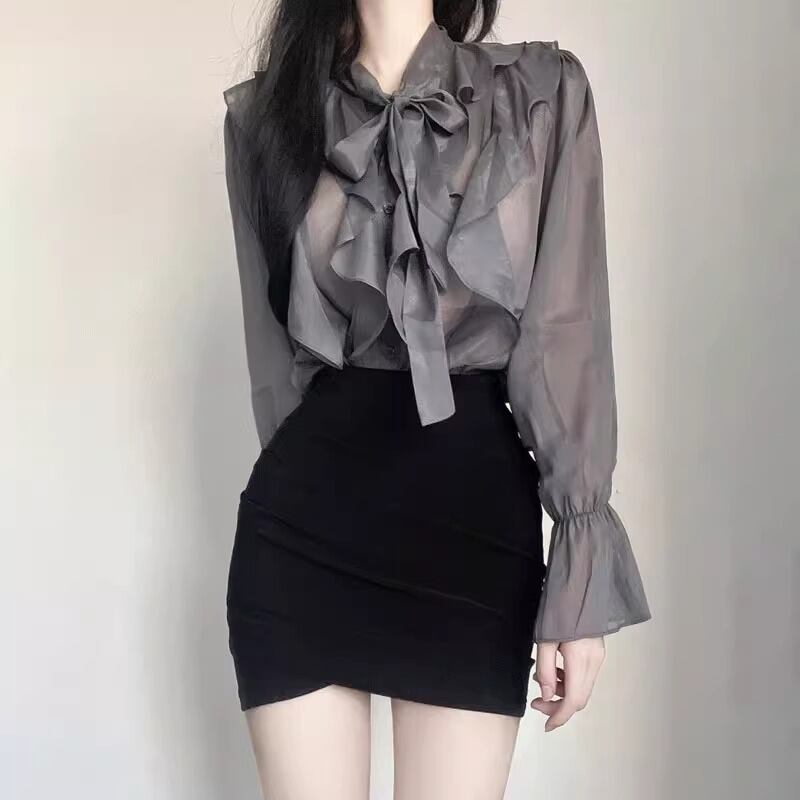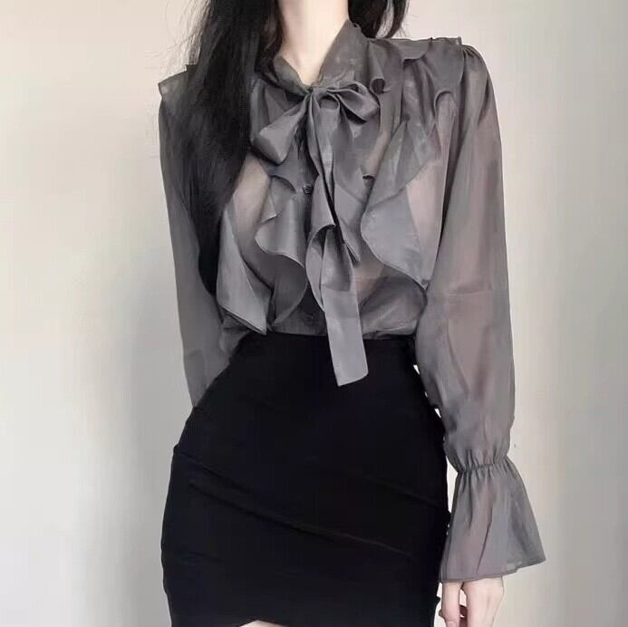 キャンディスリーブ レディース トップス シャツ ブラウス ミディ ミドル 長袖 ボリューム袖 スタンドカラー りぼんタイ フェミニン フリル リボン 透け感 シースルー シアー 大人可愛い きれいめ シンプル カジュアル おしゃれ こなれ感 エレガント 存在感 抜け感 セクシー 色気 シック センシュアル 無地 春 夏 お呼ばれ デート お出かけ イベント レストラン 女子会 ホテル ショッピング 合コン カフェ オルチャン コーデ 楽ちん レイヤード モテ S M L ゆったり グレー 大人カラー