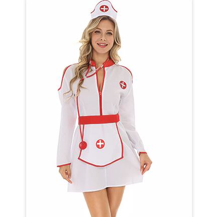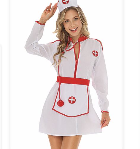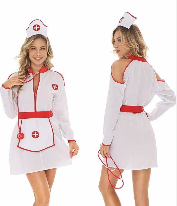 ナース衣装 4点セット レディース ワンピース セットアップ 膝上 ミニ 長袖 オープンショルダー スタンドカラー Xライン ファスナー ウエストマーク ハイウエスト 配色 パイピング かわいい 大人可愛い カジュアル 個性的 存在感 抜け感 キュート セクシー 色気 無地 ロゴ ワンポイント オールシーズン ハロウィン 文化祭 学園祭 コスプレ クラブ キャバ 演劇 舞台 ステージ 脚長 肌見せ コスチューム 衣装 仮装 小物付き M L XL 白 ホワイト
