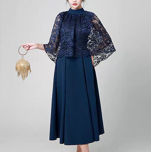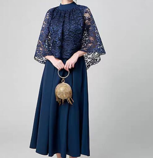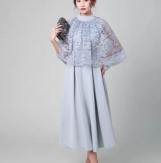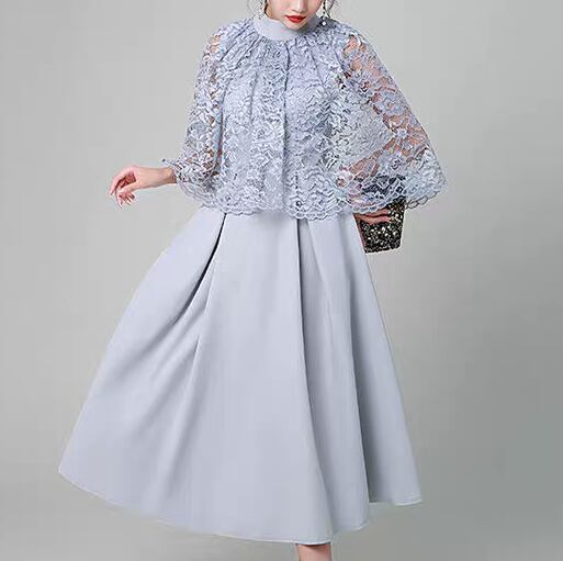レディース ワンピース ドレス 膝下 7分丈 ミディ レース袖 モックネック ケープ襟 セミフレア Aライン ドッキング フェミニン プリーツ レース ハイウエスト 透け感 きれいめ 上品 エレガント 存在感 ラグジュアリー クラシカル 華やか 無地 花柄 春 夏 誕生日 発表会 演奏会 お呼ばれ ママ パーティー レストラン ホテル 発表会 体型カバー スタイルアップ 高見え XS S M L XL 2XL 3XL ブラック グレー ブルーネイビー