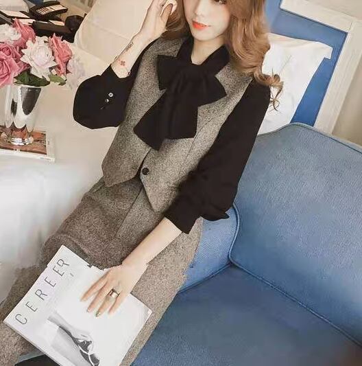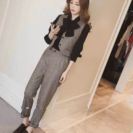 レディース パンツ ブラウス ベスト セット スリーピース 8分丈 クロップド丈 長袖 カフスリーブ りぼんタイ ストレート スマート 折り返し裾 タック リボン ハイウエスト 前開き ボタン ヴィンテージ 大人可愛い カジュアル おしゃれ かっこいい レトロ こなれ感 マニッシュ クラシカル 無地 秋 冬 授業参観 お呼ばれ ママ 通勤 お出かけ レストラン コンサート 韓国 オルチャン 美脚 レイヤード S M L XL ベージュ