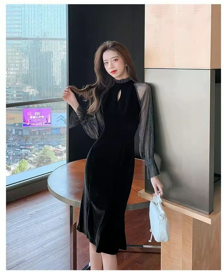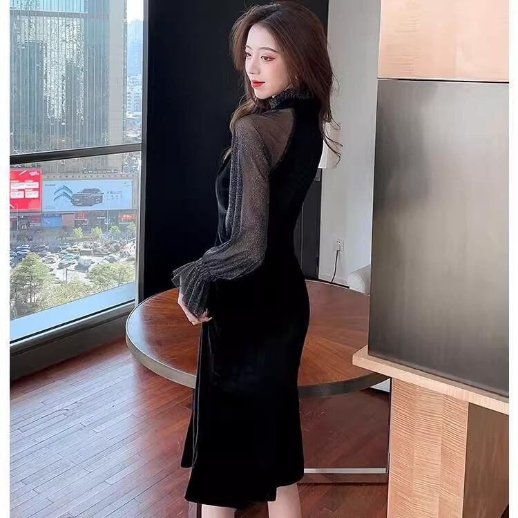 フリルスカートと透け感のある長袖が特徴的で、エレガントでありながらもクールな印象を与えます。ミディ丈のタイトシルエットは、女性らしいラインを引き立て、特別なお出かけやパーティーにぴったりです。色気を演出するシースルーのデザインは、存在感を与えること間違いなし。上品なベルベット素材を使用し、華やかさとゴージャス感が漂います。