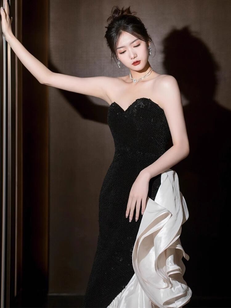 大人可愛いおしゃれなレディースドレスです!ロングタイトデザインにしっかりとしたフリルが施され、シルエットを美しく引き立てます。ハイウエストデザインがスタイルを良く見せるだけでなく、脚長効果も抜群です。華やかでありながら、セクシーさとクールさを併せ持つこのドレスは、パーティーやイベント、発表会など、あらゆるシーンで主役級の存在感を発揮します。
