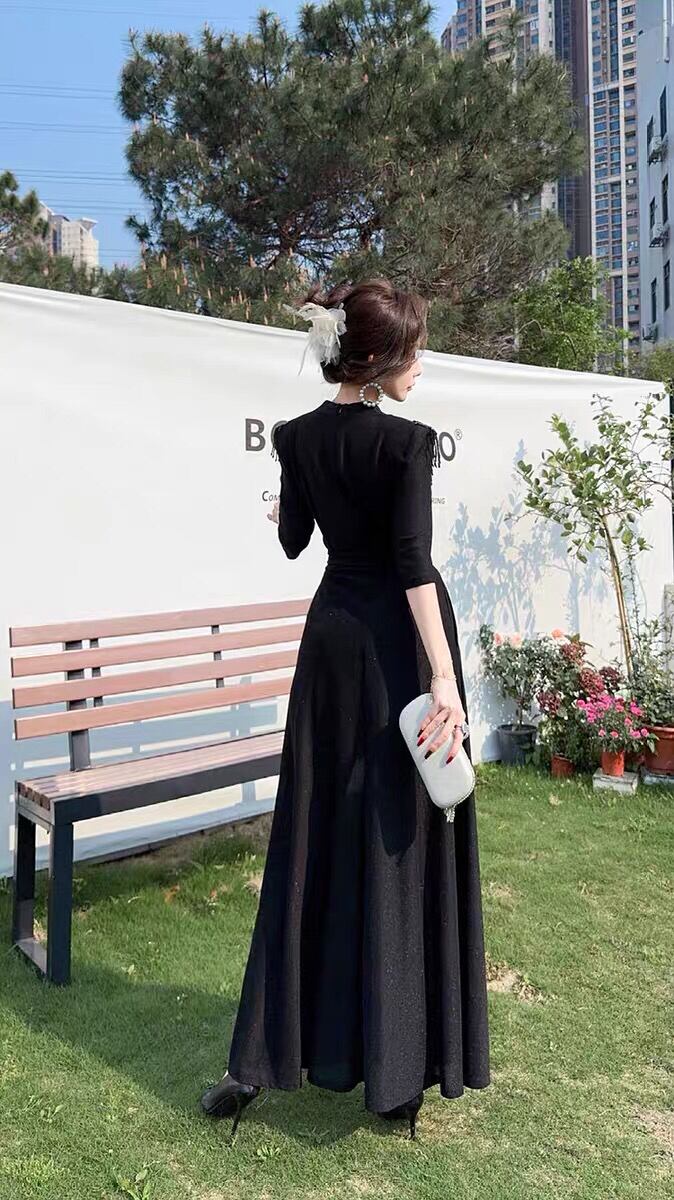 レディース ドレス ワンピース パーティー フリンジ 結婚式 二次会 発表会 ステージ 舞台 衣装 コスチューム 膝下 ロング 5分袖 Vネック フレア Aライン 可愛い きれいめ シンプル 大人可愛い 上品 おしゃれ かっこいい エキゾチック キュート ガーリー モード エレガント モダン 主役級 存在感 クラシック 清楚 ゴージャス エレガント 華やか ナチュラル パーティー イベント ホテル ガーデン 体型カバー 美脚 脚長 高見え スタイルアップ 春 夏 2XL M L XL ブラック レッド