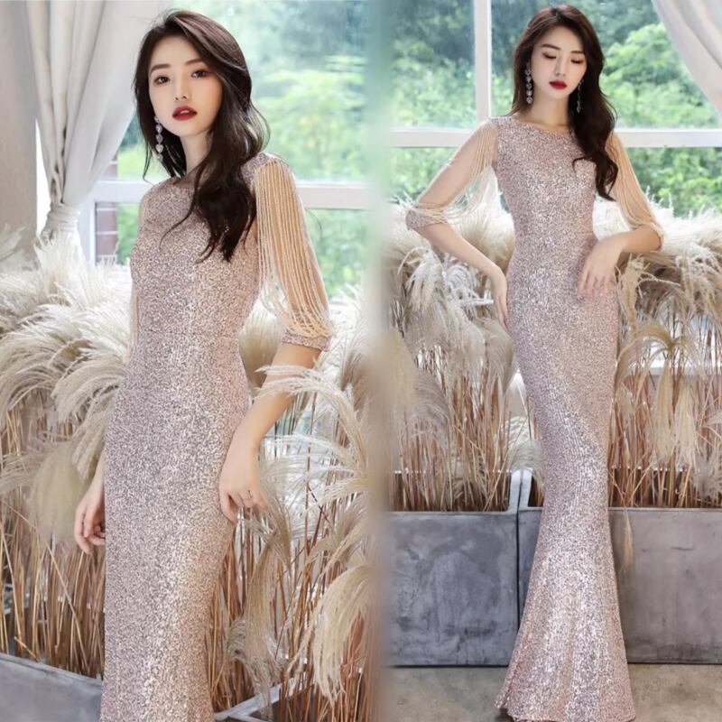 スパンコールが煌めく、エレガントなマーメイドドレスです!シアー素材の五分袖がフェミニンな印象を与え、ビーズのディテールが華やかさを加えています。春や夏のパーティーやイベントにぴったりな、このドレスは、存在感がありながらも上品さを忘れないデザインです。特別なシーンで主役級の魅力を演出します!