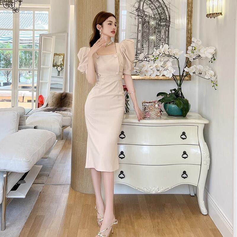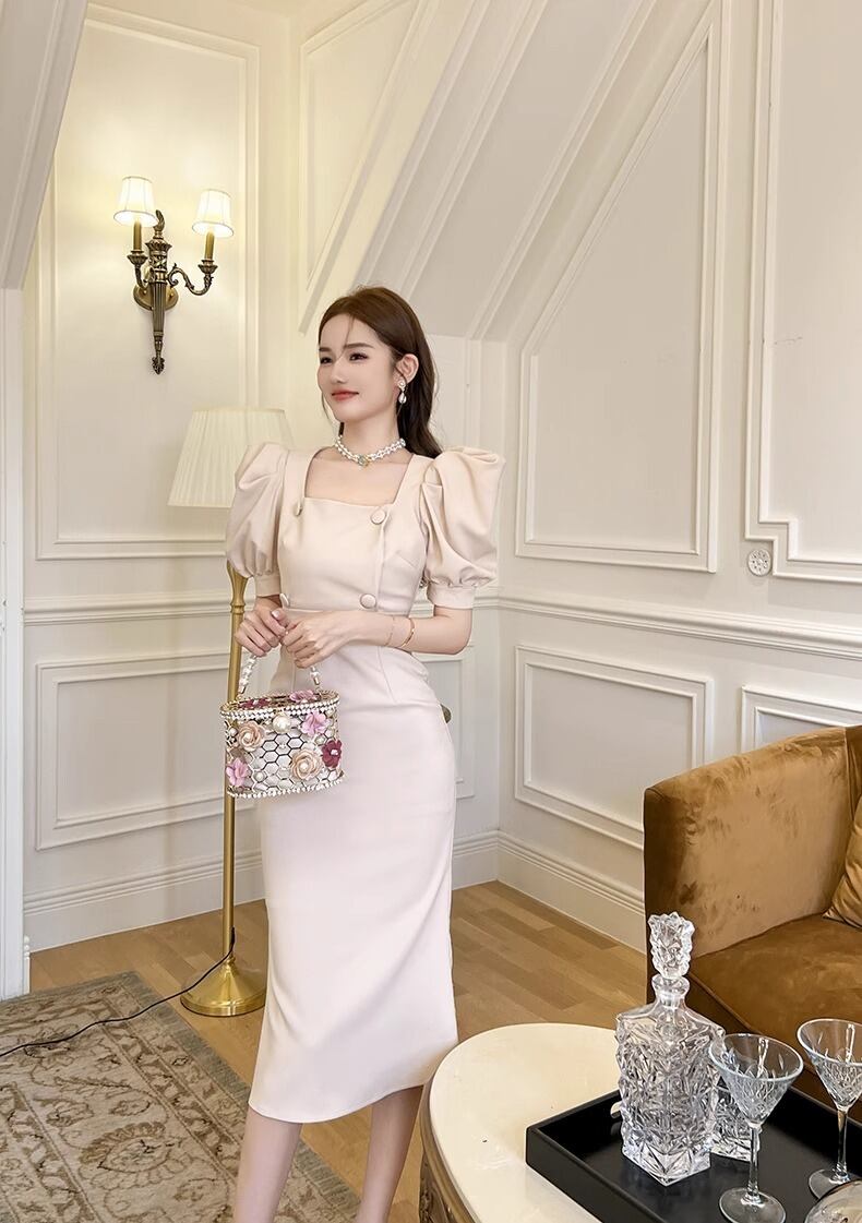 このワンピースは、スタイルアップを実現するタイトシルエットが魅力!パフスリーブが女性らしさを引き立て、スクエアネックが上品さをプラスします。ウエストマークデザインがシェイプされたラインを演出し、ファスナー付きで着脱も簡単。シンプルながらも存在感のある一着です。