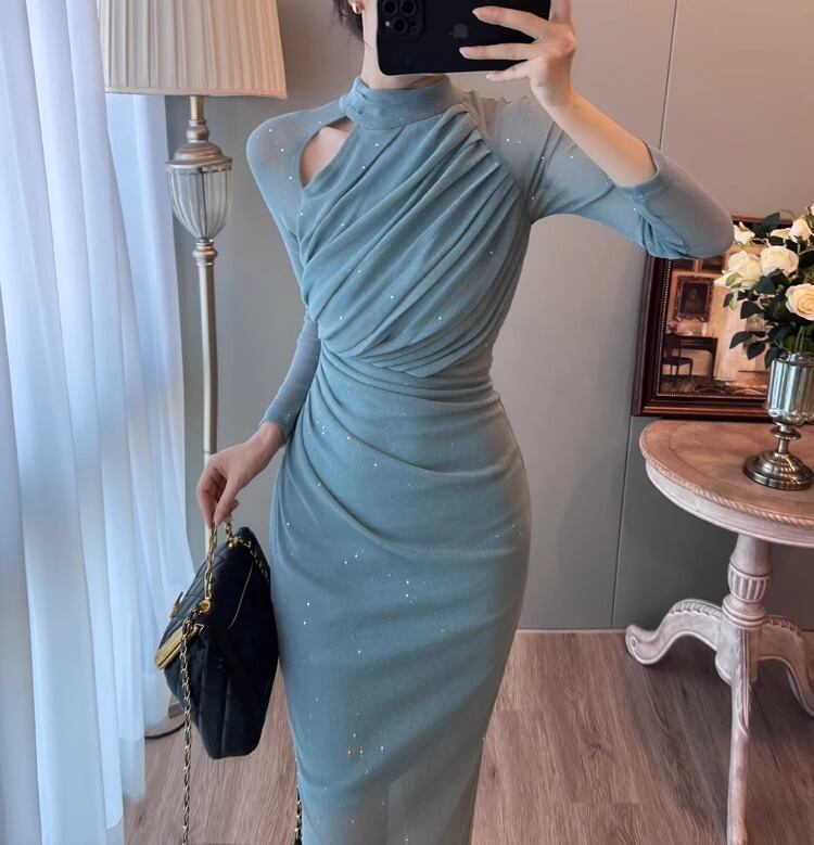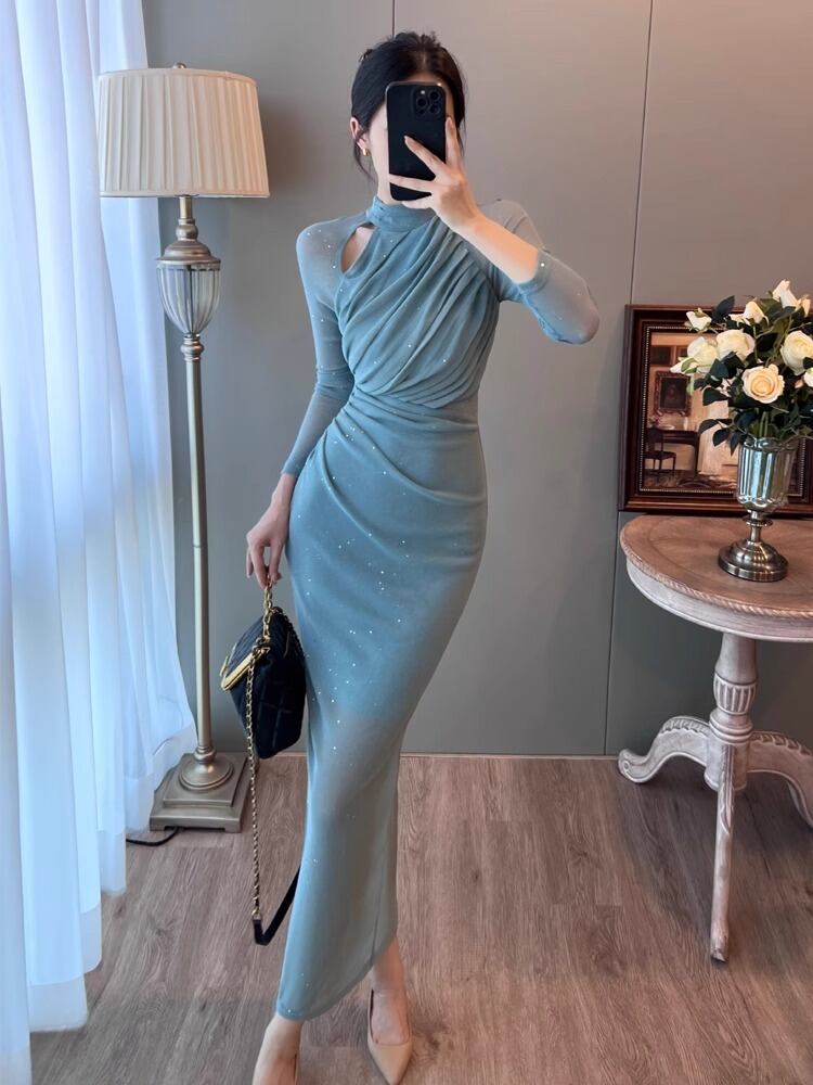 スカート ワンピース ドレス ロング 7分袖 長袖 ホルターネック タイト スリム 細身 ストレート ウエストマーク ファスナー ハイウエスト 透け感 メッシュ 大人可愛い きれいめ シンプル カジュアル 上品 おしゃれ かっこいい こなれ感 クール 色気 無地 春 夏 秋 冬 オールシーズン ロングシーズン シーズンレス デート パーティー イベント レストラン ホテル 発表会 コンサート コーデ 楽ちん 美脚 脚長 モテ 清楚 スタイルアップ コスチューム 衣装 S M L ブルー くすみ 大人カラー