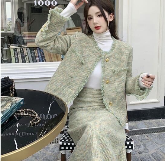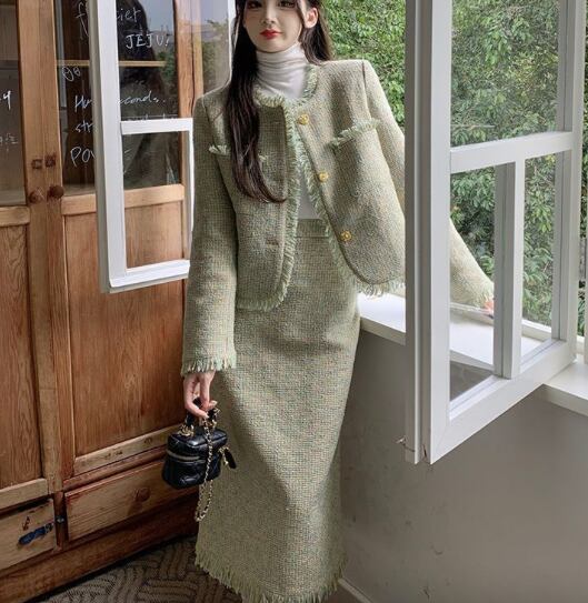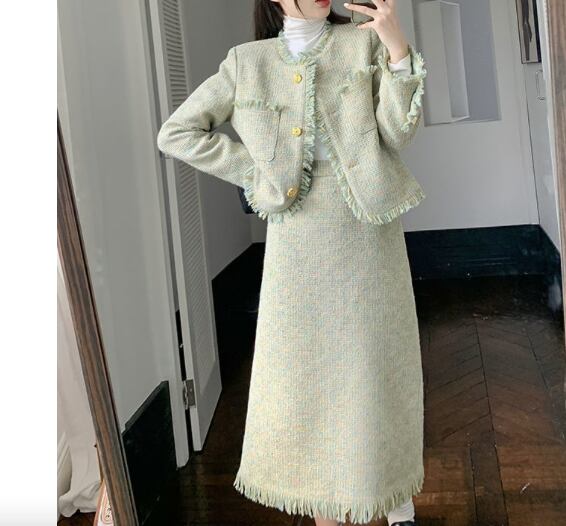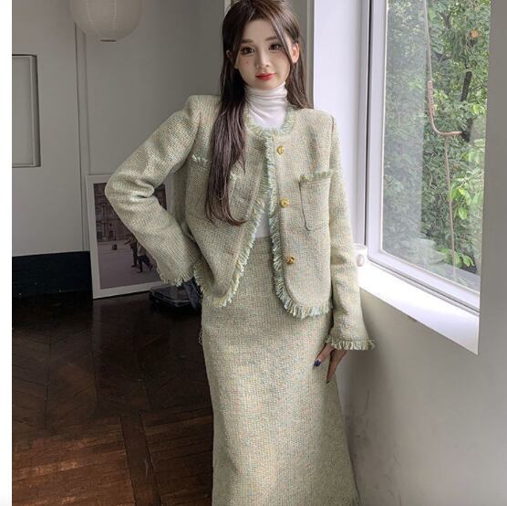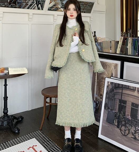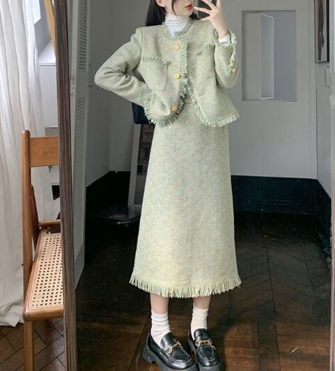 レディース スーツ セットアップ 膝下 クロップド丈 ミディ ミドル 長袖 ラウンドネック 襟なし ノーカラー セミフレア スマート セパレート スリット バックスリット ハイウエスト 前開き ツイード ボタン 配色 カットアウト 飾りボタン フリンジ ツイード かわいい 大人可愛い おしゃれ こなれ感 キュート クラシカル 爽やか 秋 冬 同窓会 お呼ばれ ママ OL お出かけ レストラン 休日 ホテル ショッピング 婚活 韓国 オルチャン 美脚 脚長 着回し レイヤード モテ M L XL 2XL 緑