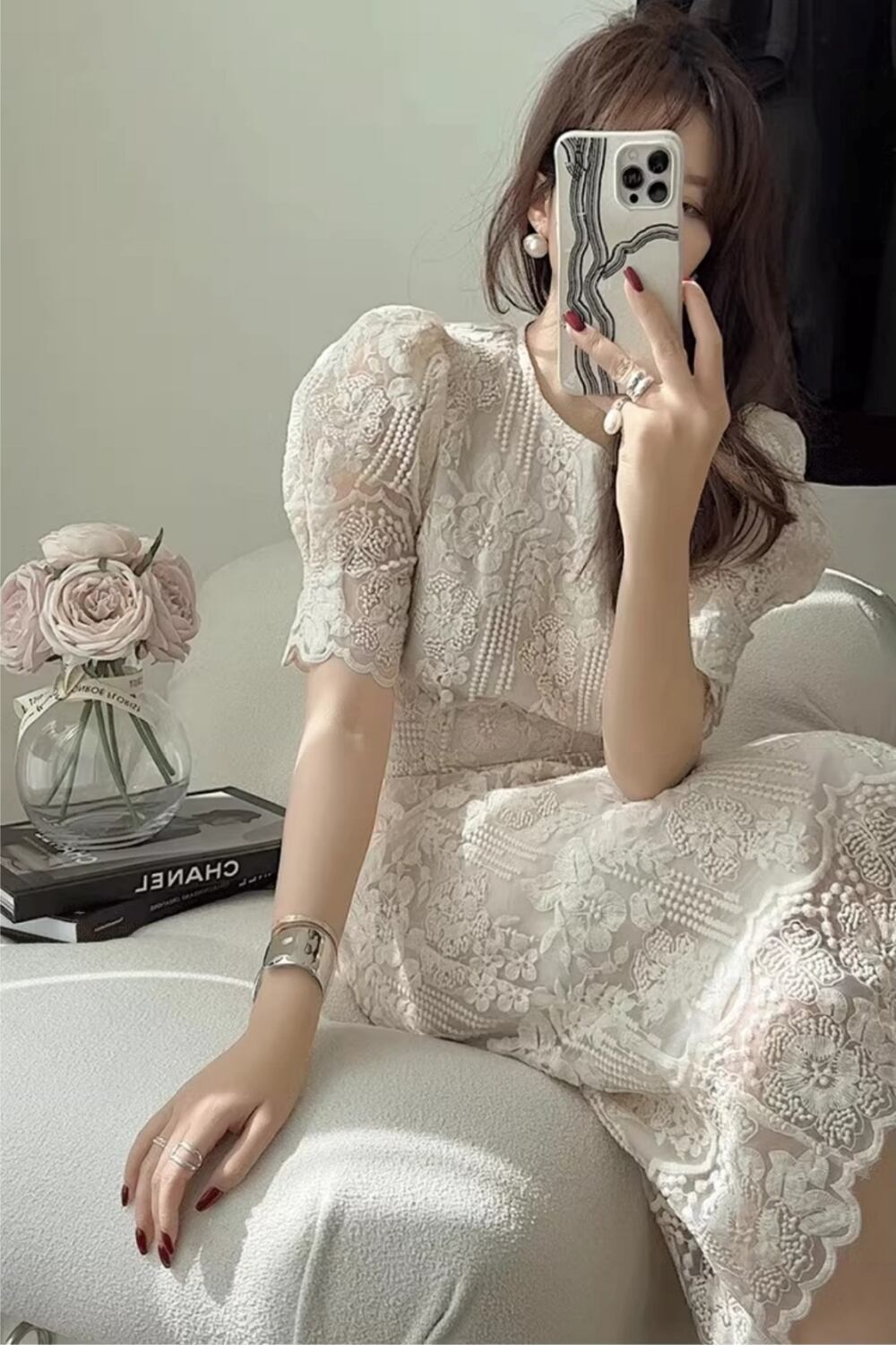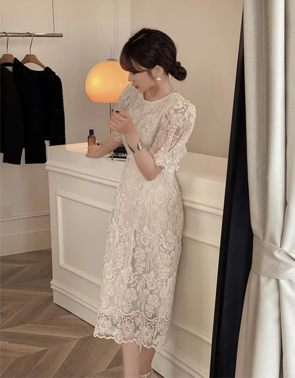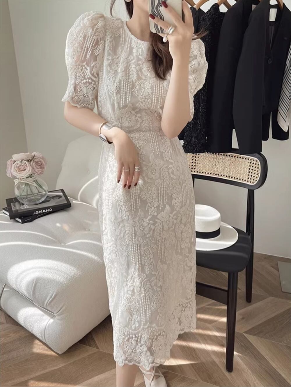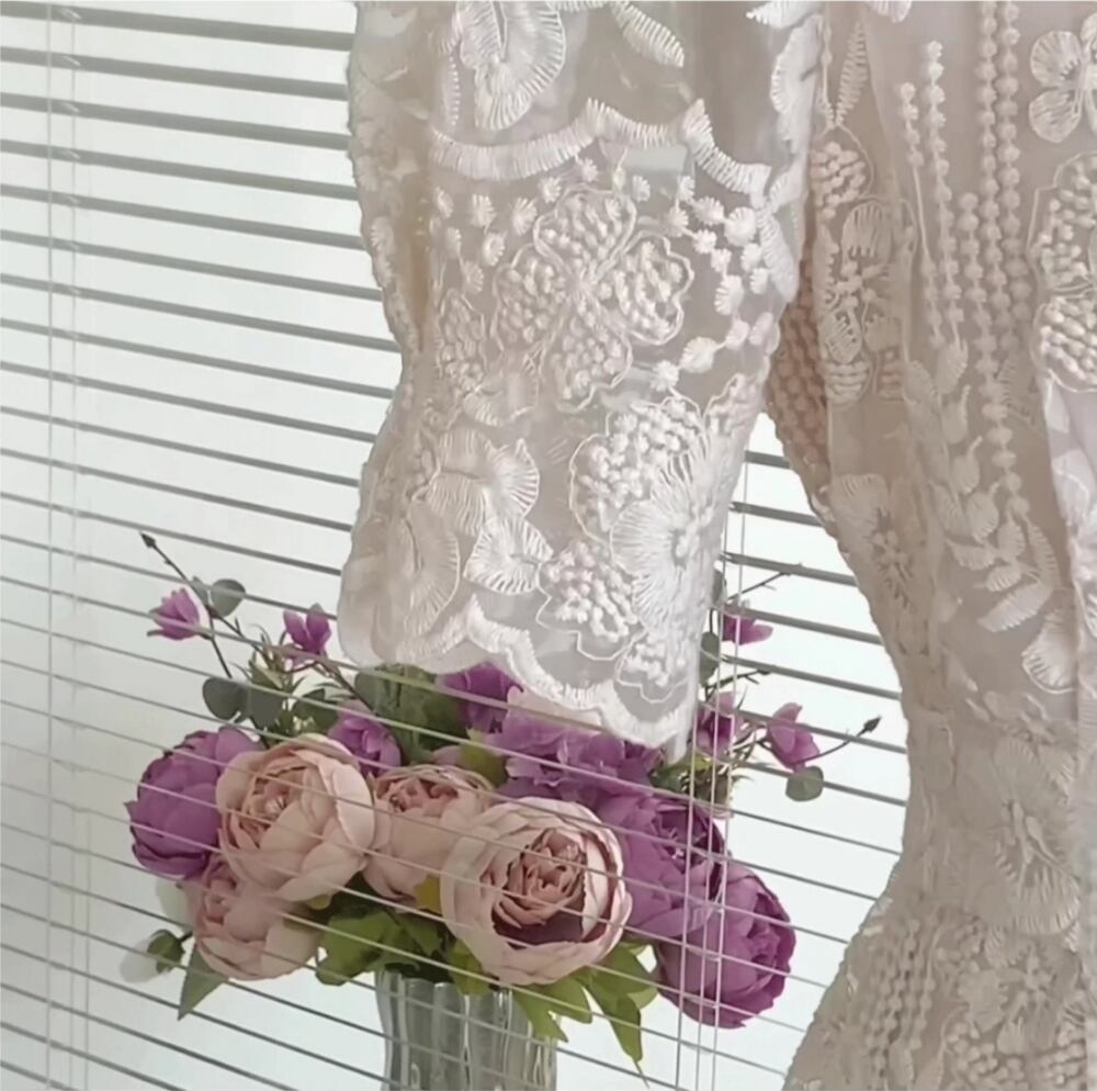 大人可愛い魅力を引き立てる、ワンピースのご紹介です!繊細な花柄刺繍が施されたミモレ丈のデザインが、女性らしさを引き立て、エレガントな印象を与えます。パフスリーブとラウンドネックの組み合わせは、爽やかさと清楚な雰囲気を醸し出し、バックリボンもアクセントとして存在感を放ちます。