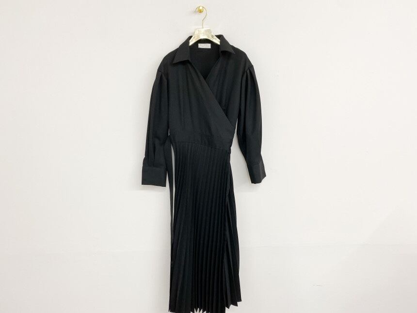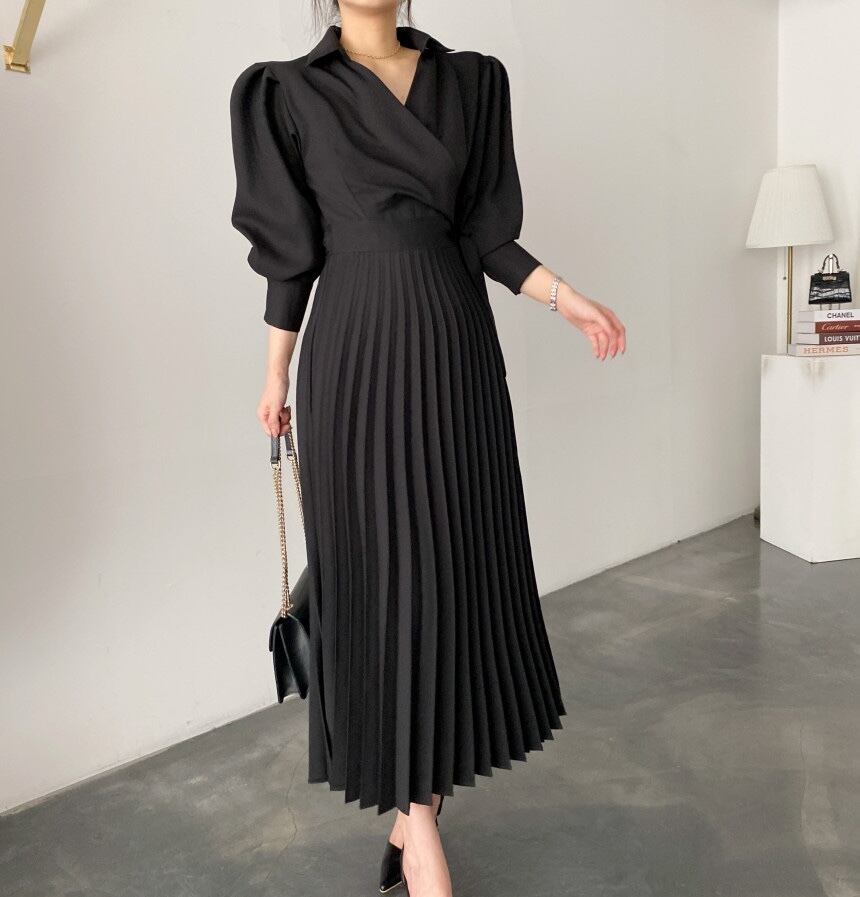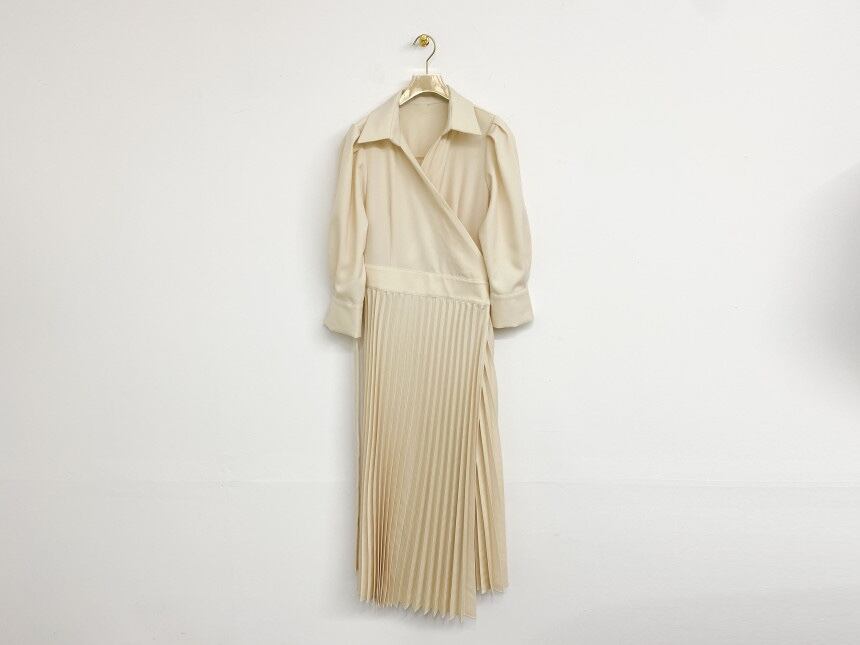 カシュクールとボリュームスリーブが特徴的で、レトロな雰囲気を演出します。膝下まで届くロング丈は、上品さを兼ね備え、シンプルながらも存在感を放っています。プリーツスカートがふんわりとした動きをもたらし、清潔感のあるスタイルに仕上げちゃいます。温もりを感じさせる大人可愛いデザインで、普段使いから特別なお出かけまで幅広く対応します。