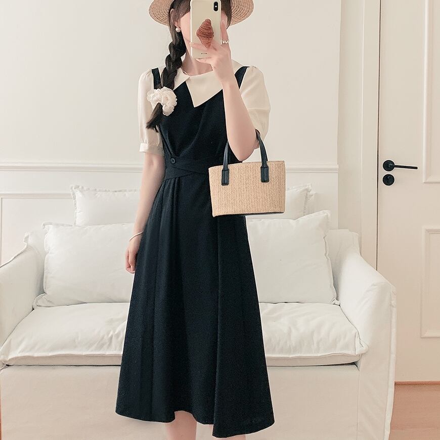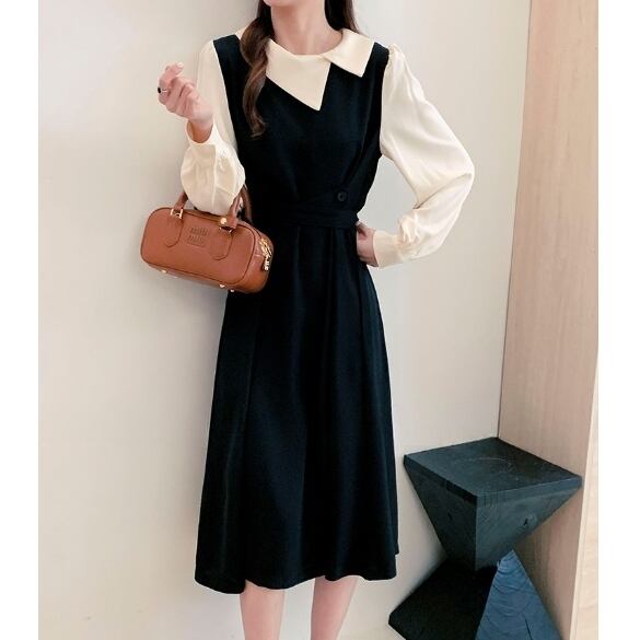 大人可愛い印象を与えるレディースワンピースで、春夏秋冬を通じて様々なシーンで活躍します!こちらのアイテムは、ツートーンデザインとアシンメトリーな襟が特徴で、モードな雰囲気を醸し出します。膝下ミモレ丈のフレアデザインが体型をカバーしつつ、女性らしさを引き立ててくれます。