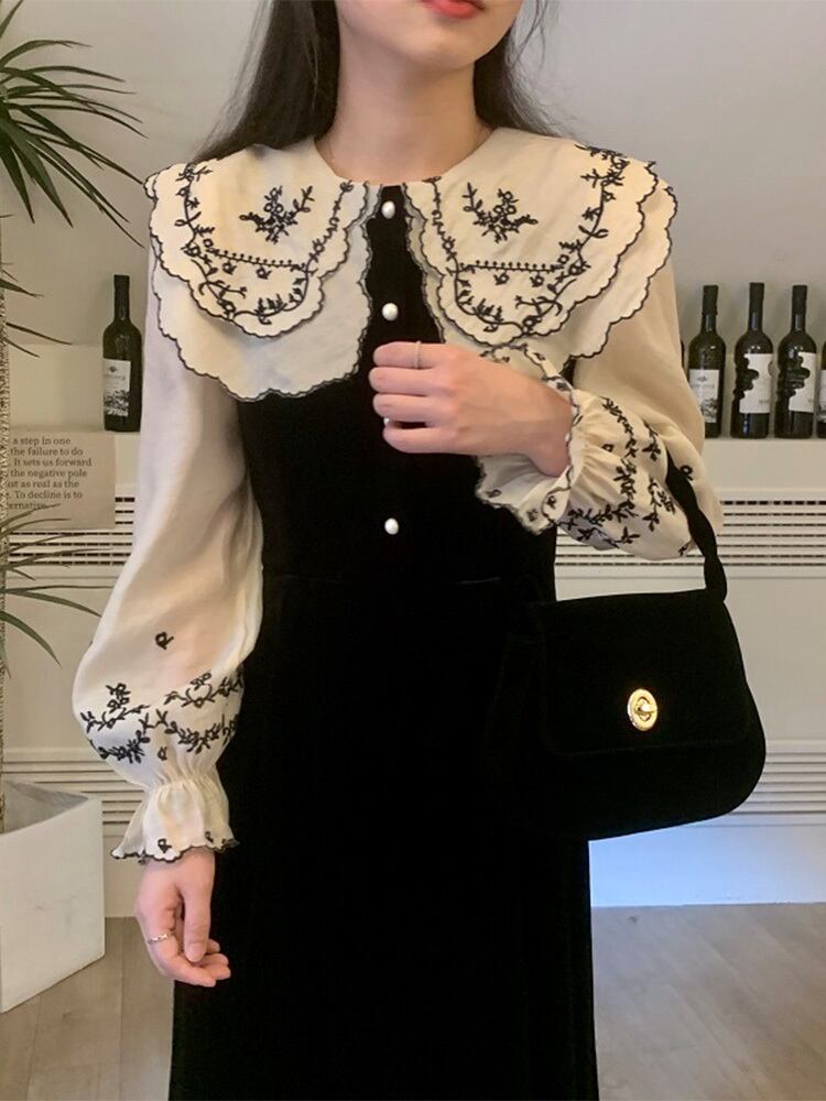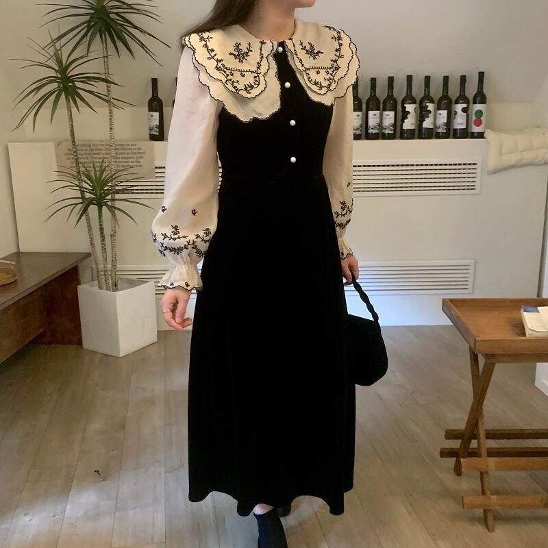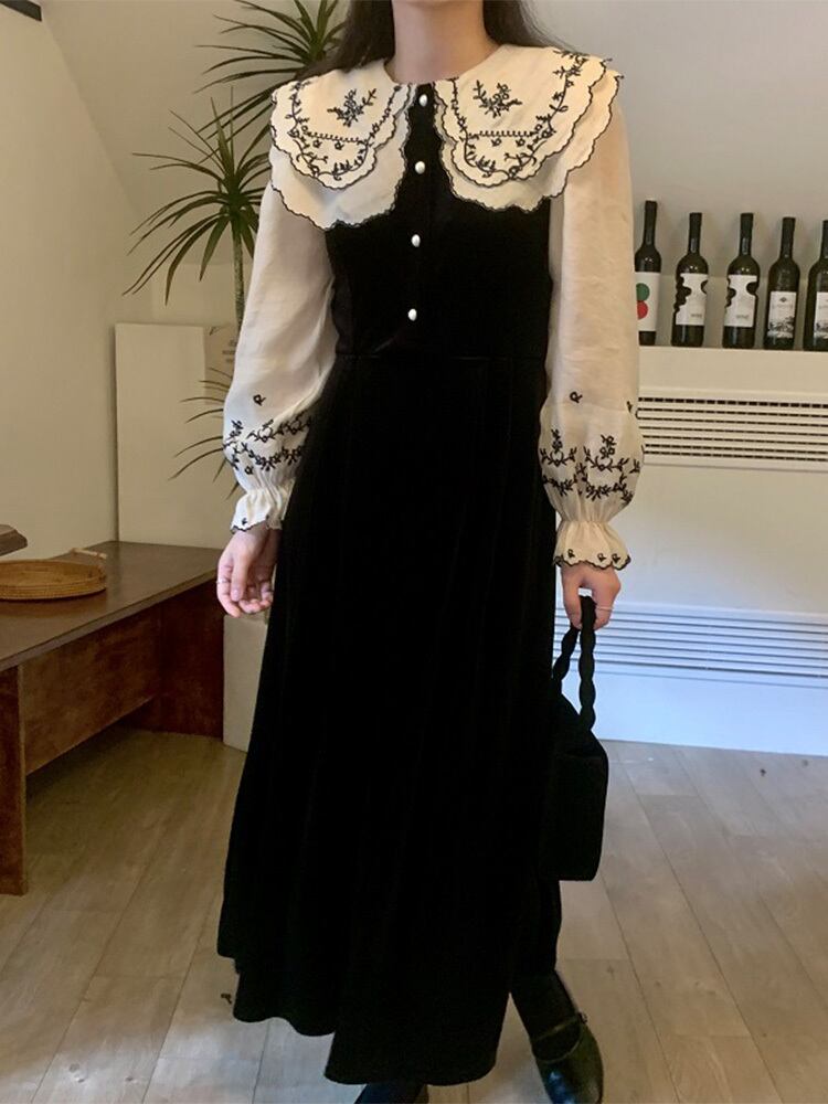 大人可愛い印象を与えるレディースワンピースで、春秋冬を通じて様々なシーンで活躍します!こちらのアイテムは、大ぶりの襟がドーリーで可愛い印象を与え、モノトーンの刺繍が上品なアクセントとなっています。膝下ロング丈のフレアAラインデザインは、女性らしさを引き立てつつ体型をカバーし、着る人を主役にしてくれる存在感抜群の一着です。