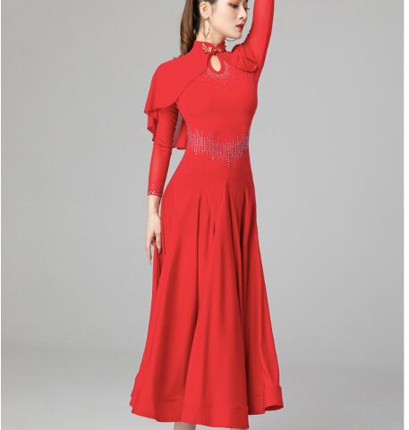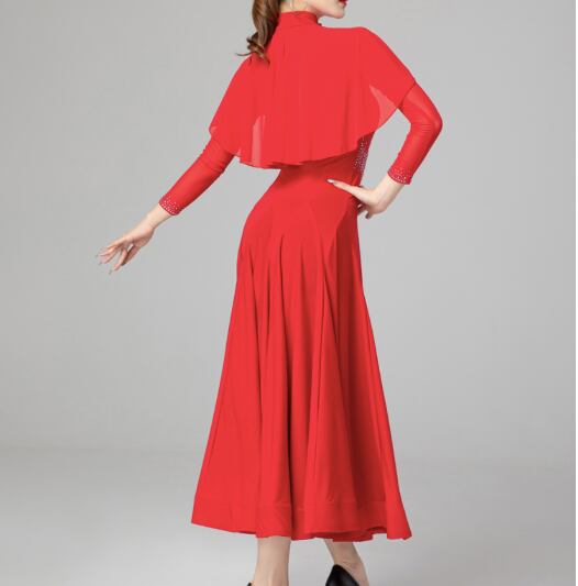 レディース ドレス カラードレス 発表会 ステージ 舞台 ダンス 衣装 コスチューム ミモレ ロング 長袖 ケープ襟 フレア Xライン プリーツ ケープ ドッキング マント ビジュー スパンコール きれいめ 上品 レトロ クール エレガント モダン 主役級 存在感 クラシック エレガント クラシカル 無地 脚長 スタイルアップ シーズンレス 発表会 舞台 2XL 大きい M L XL レッド
