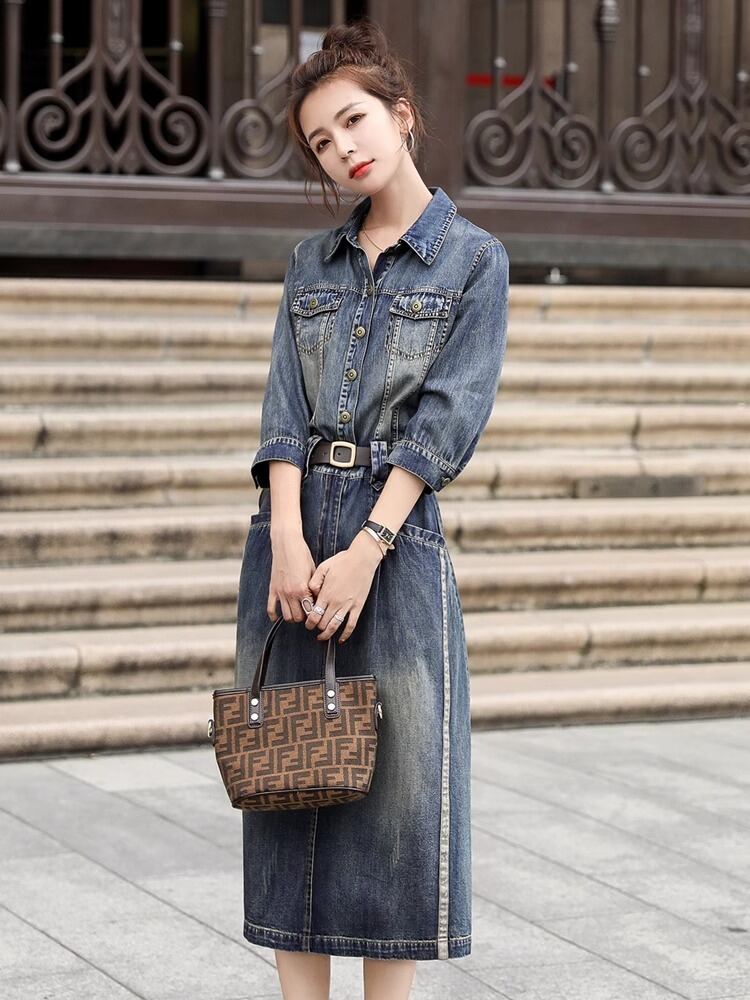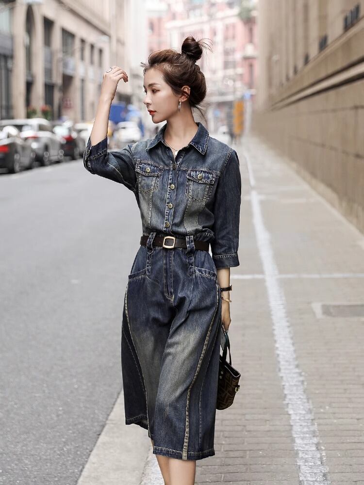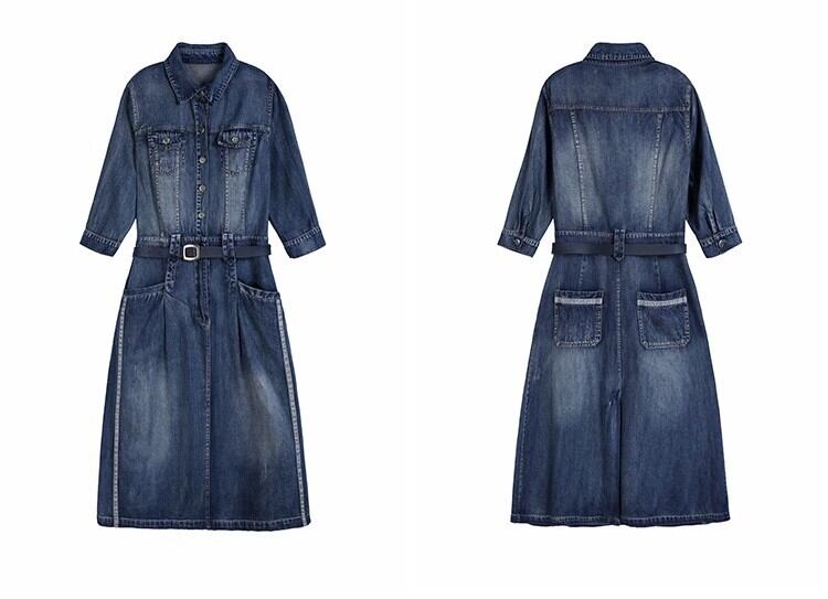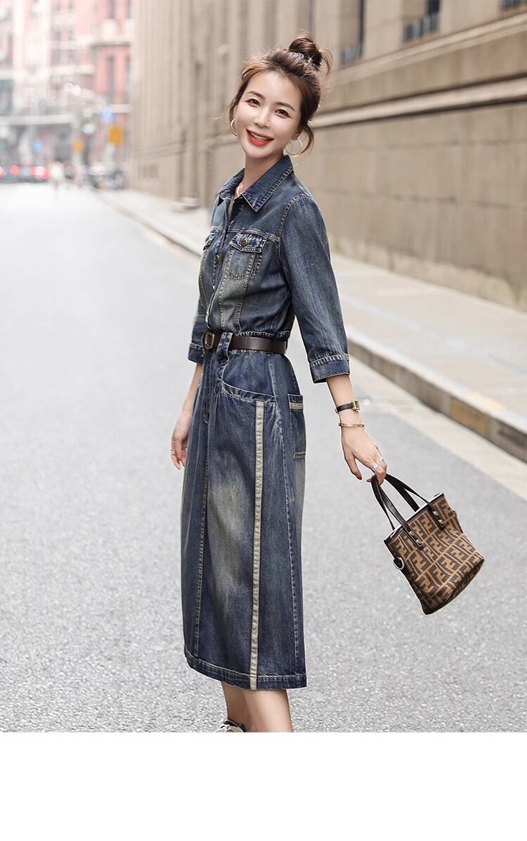 レディース ワンピース デニム 膝下 ミモレ 7分袖 襟付き 角襟 スリム Aライン ベルト ウエストマーク ポケット ハイウエスト 前開き ボタン かわいい 大人可愛い きれいめ シンプル カジュアル 上品 おしゃれ かっこいい こなれ感 ラフ ガーリー クール 抜け感 ヴィンテージ ナチュラル 無地 春 秋 デート お出かけ 旅行 休日 バカンス ショッピング コーデ 楽ちん 体型カバー 脚長 モテ 清楚 スタイルアップ M L XL 2XL ゆったり ゆる ブルー ベーシックカラー 大人カラー