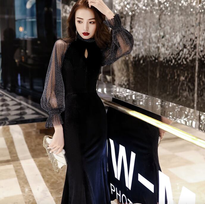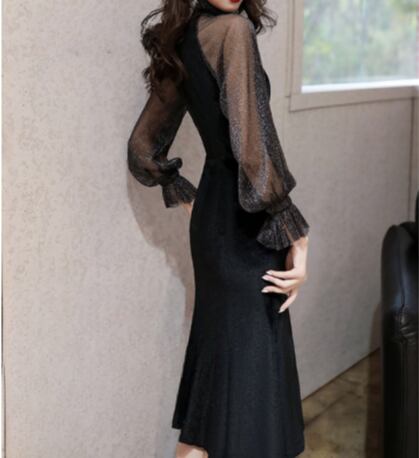 レディース ワンピース ドレス 膝丈 膝下 ミディ 長袖 ボリューム袖 ラメ感 ラッフルカフス スタンドカラー マーメイド ドッキング フィット&フレア ウエストシェイプ プリーツ フリル ハイウエスト 透け感 切り替えデザイン メッシュ 異素材ミックス 伸縮性 きれいめ 上品 こなれ感 クール エレガント モダン 主役級 存在感 ラグジュアリー セクシー 無地 春 夏 二次会 お呼ばれ デート お出かけ パーティー イベント レストラン ホテル 発表会 モテ 肌見せ S M L 黒