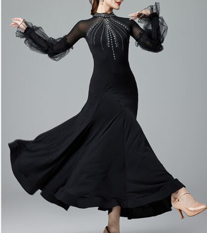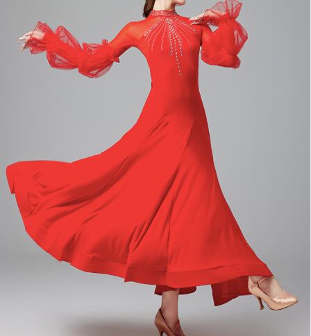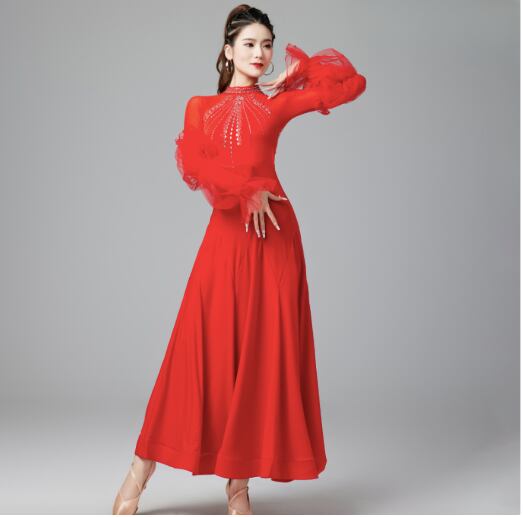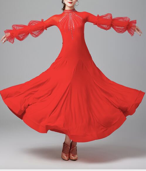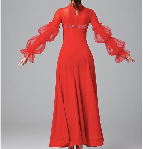 レディース ドレス 発表会 ステージ 舞台 ダンス 衣装 コスチューム ロング アンクル丈 長袖 パフスリーブ フリル袖 襟なし スタンドカラー フレア Aライン プリーツ レース フリル 切り替えデザイン ドッキング バックコンシャス ハイウエスト シアー きれいめ 上品 エレガント モダン 主役級 存在感 エレガント 華やか 無地 ラインストーン 脚長 スタイルアップ シーズンレス 発表会 舞台 2XL 大きいサイズ M L XL 黒 レッド