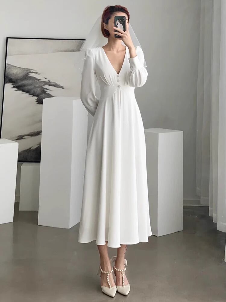 大人の女性にぴったりな、シンプルで上品なレディースドレスです!長袖のVネックデザインが、女性らしさとエレガンスを演出します。セミフレアのシルエットは体型を美しくカバーし、ハイウエストのデザインが脚長効果をもたらします。無地のベーシックカラーで、どんなシーンにも合わせやすく、春夏秋冬のオールシーズンでお楽しみいただけます。誕生日や結婚式、披露宴などの特別な場面にも最適です。