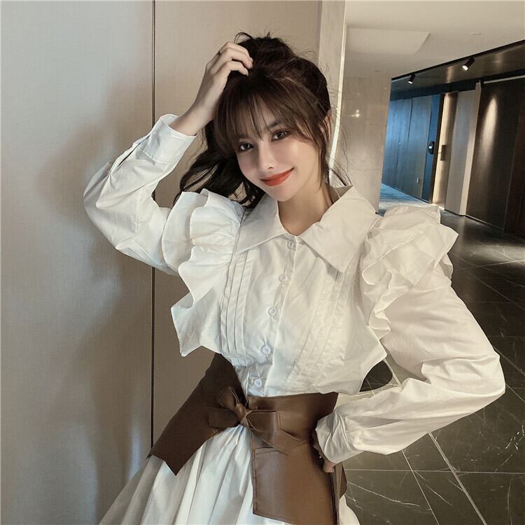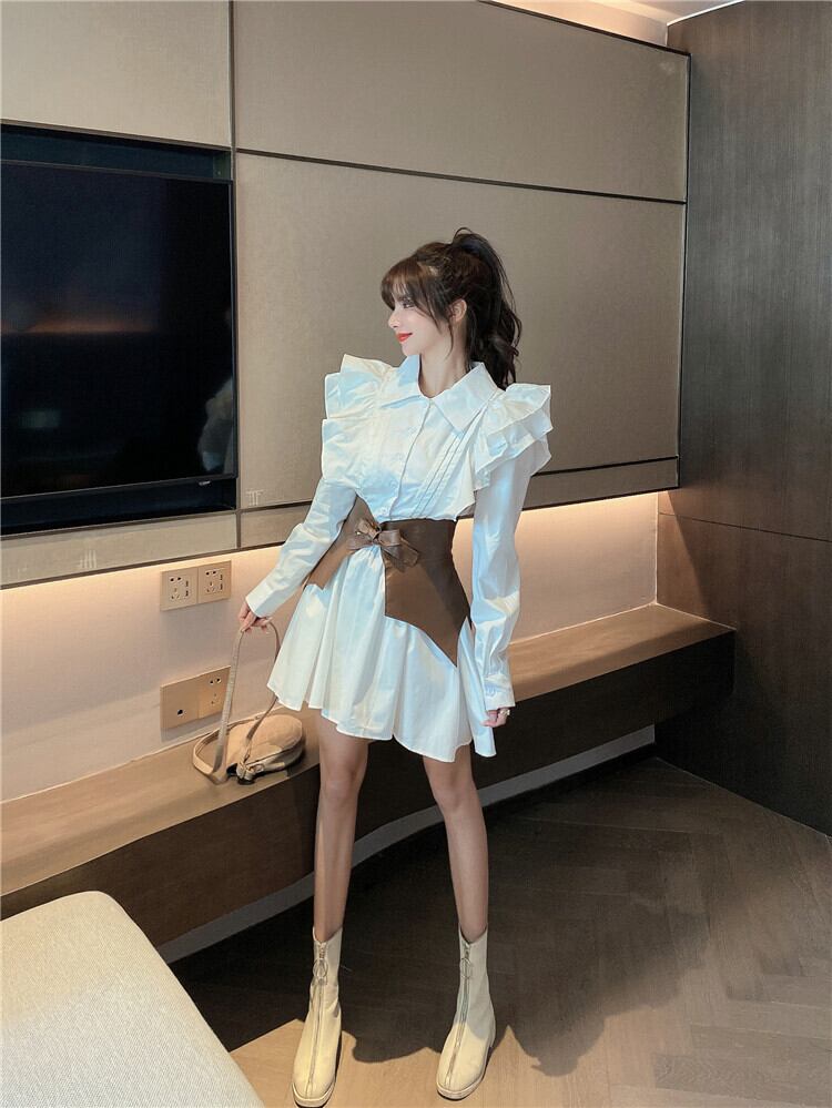 レディース ワンピース シャツワンピ ミニ ショート 長袖 角襟 フレア Aライン Xライン タック フリル ウエストマーク ハイウエスト サファリベルト 太ベルト ベルト付き かわいい きれいめ 上品 おしゃれ レトロ こなれ感 ラフ ガーリー ルーズ 個性的 モード系 抜け感 ラブリー キュート アメリカン ロマンティック 華やか 可愛い ドレッシー アバンギャルド エッジィ 無地 春 秋 デート お出かけ 休日 体型カバー 普段使い トレンド スタイルアップ S M L ゆったり ゆる 白 ホワイト
